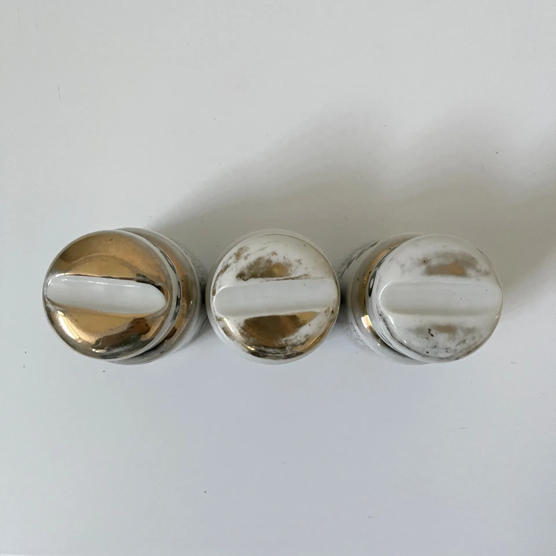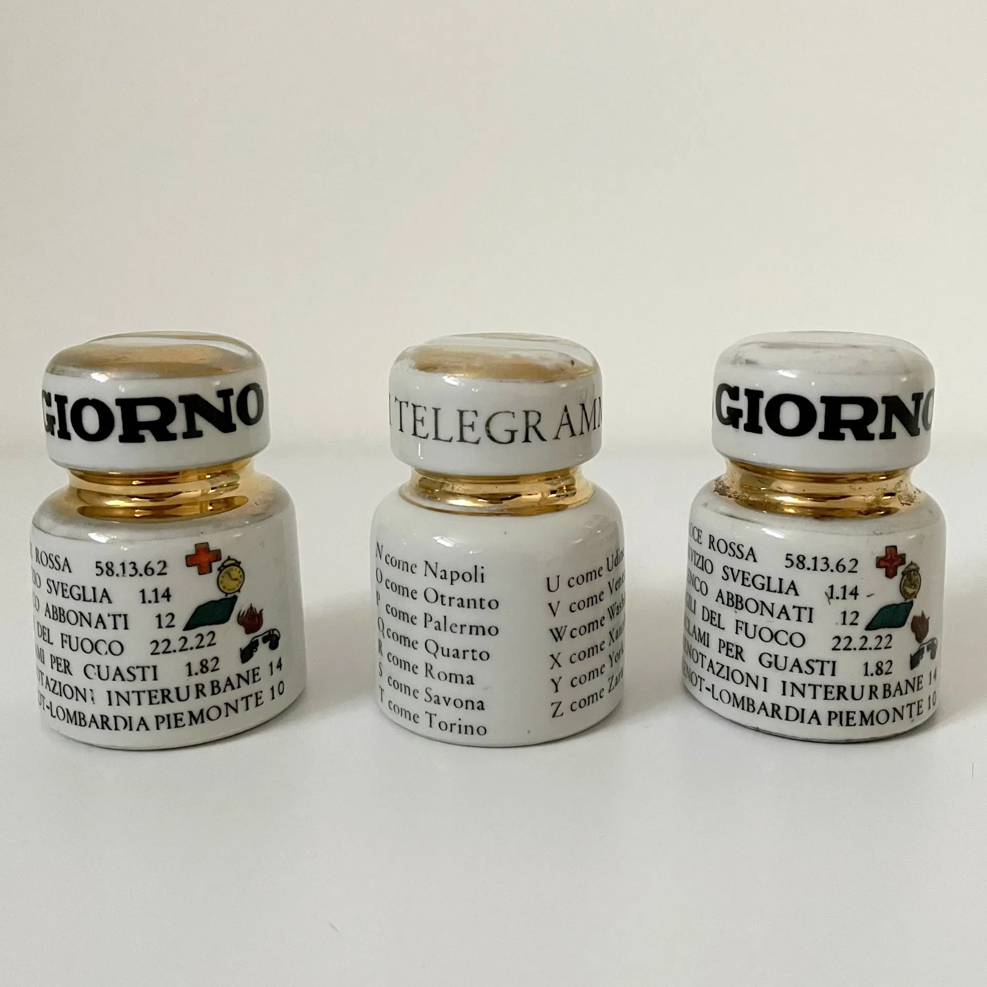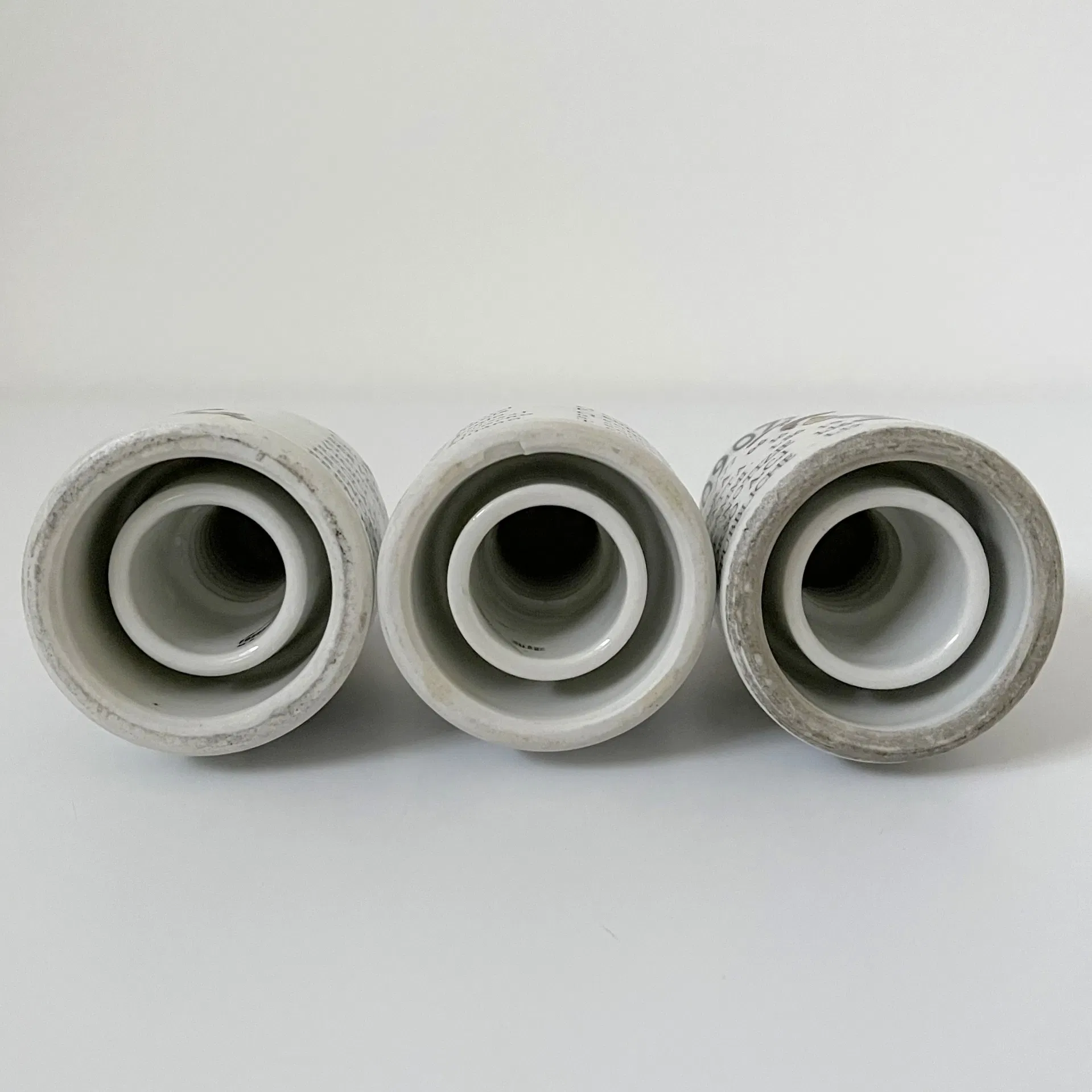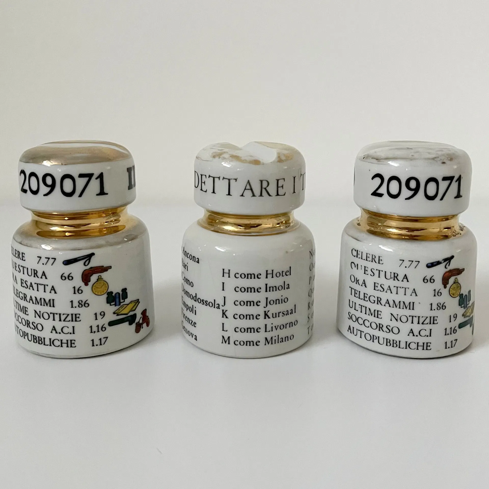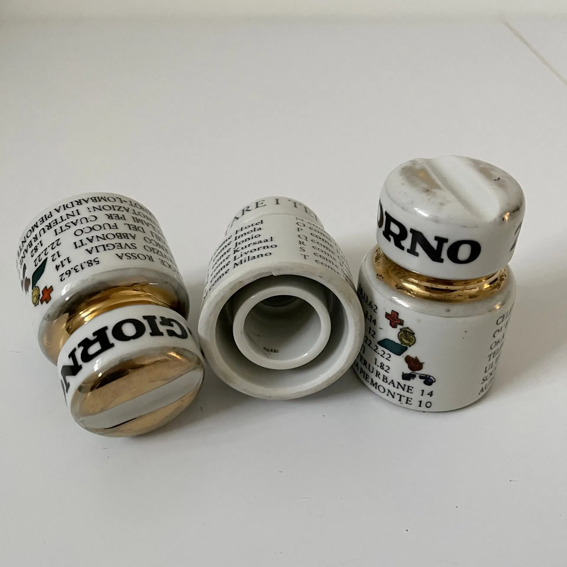 Tre fermacarte a foggia di isolatori elettrici realizzati su un’idea di Piero Fornasetti, ceramica serigrafata, anni ’50 – ’60.