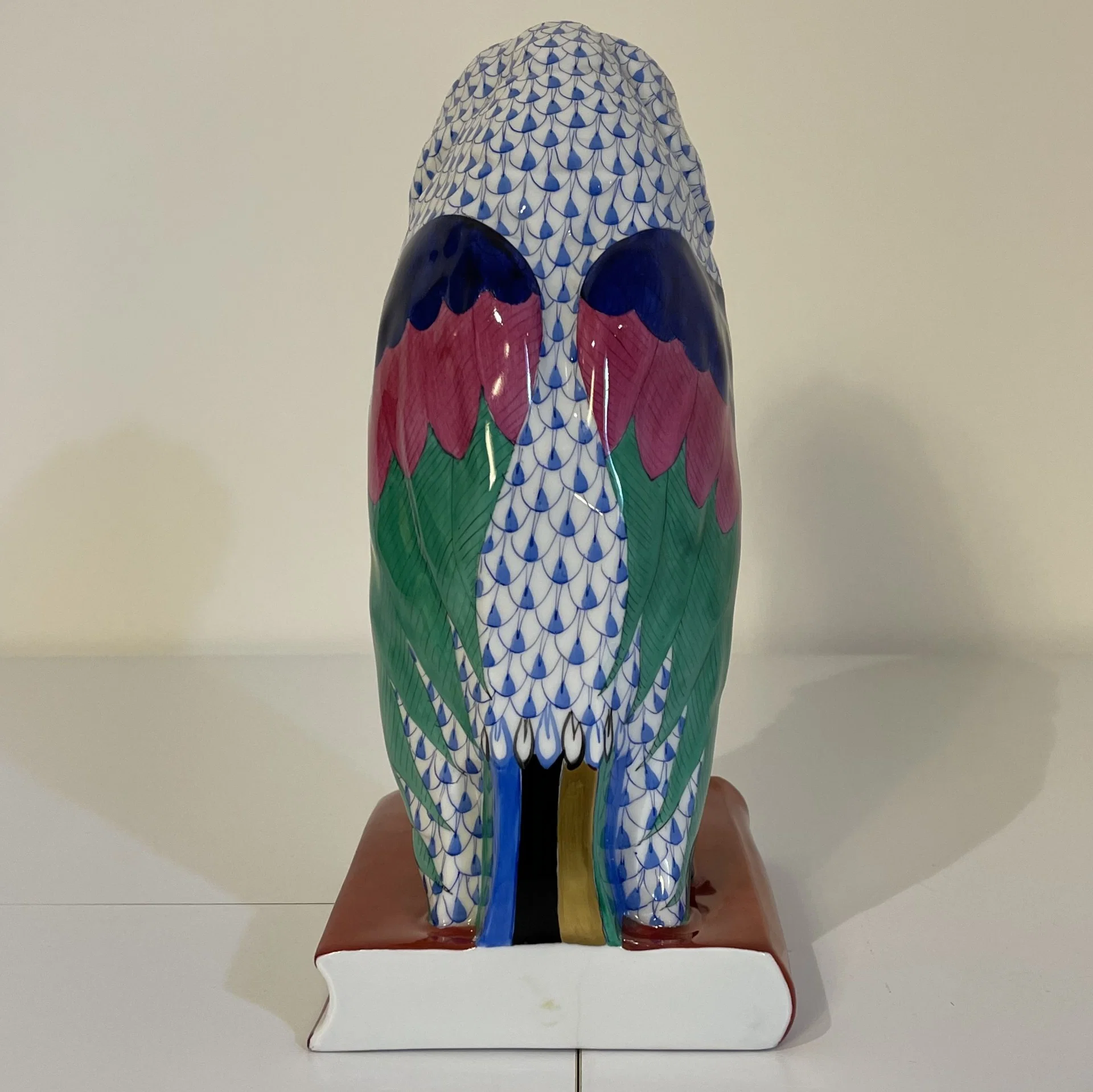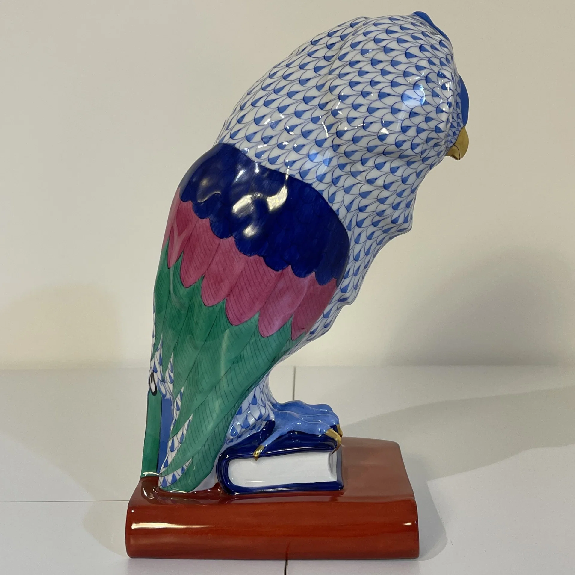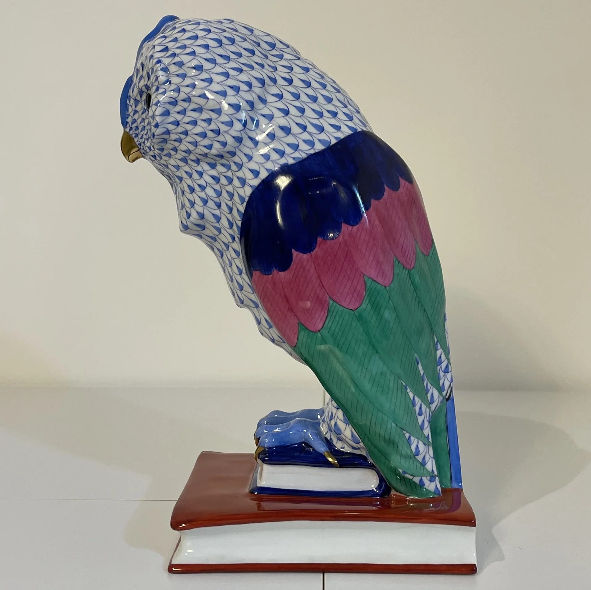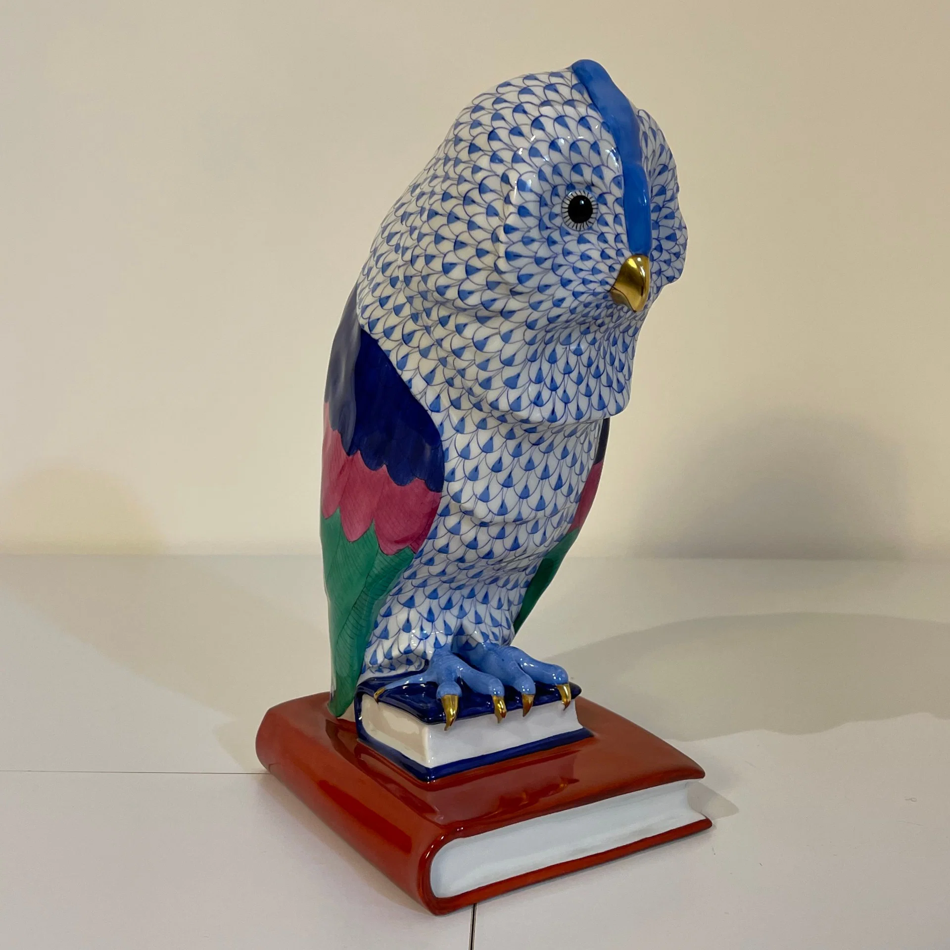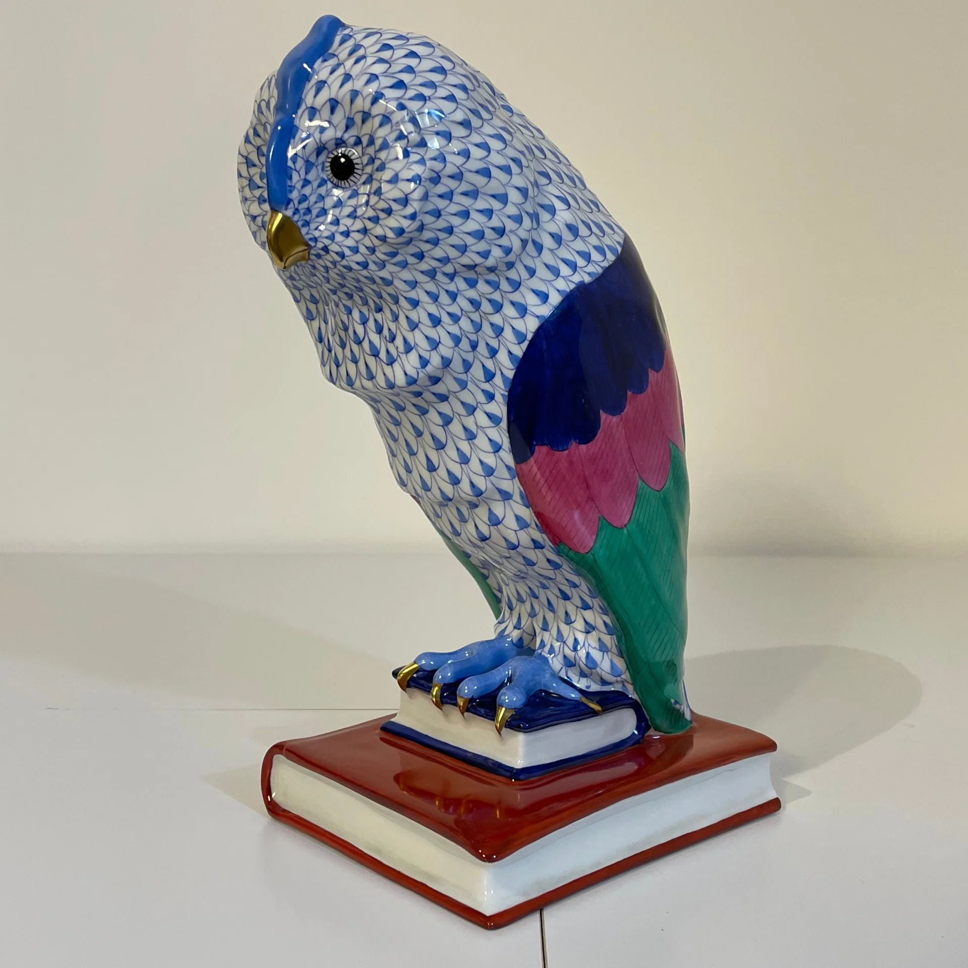 Statuina in porcellana dipinta a mano in policromia raffigurante un gufo appollaiato su due libri, opera realizzata presso la storica manifattura ungherese Herend, una delle più importanti e riconosciute a livello mondiale nel settore della porcellana.