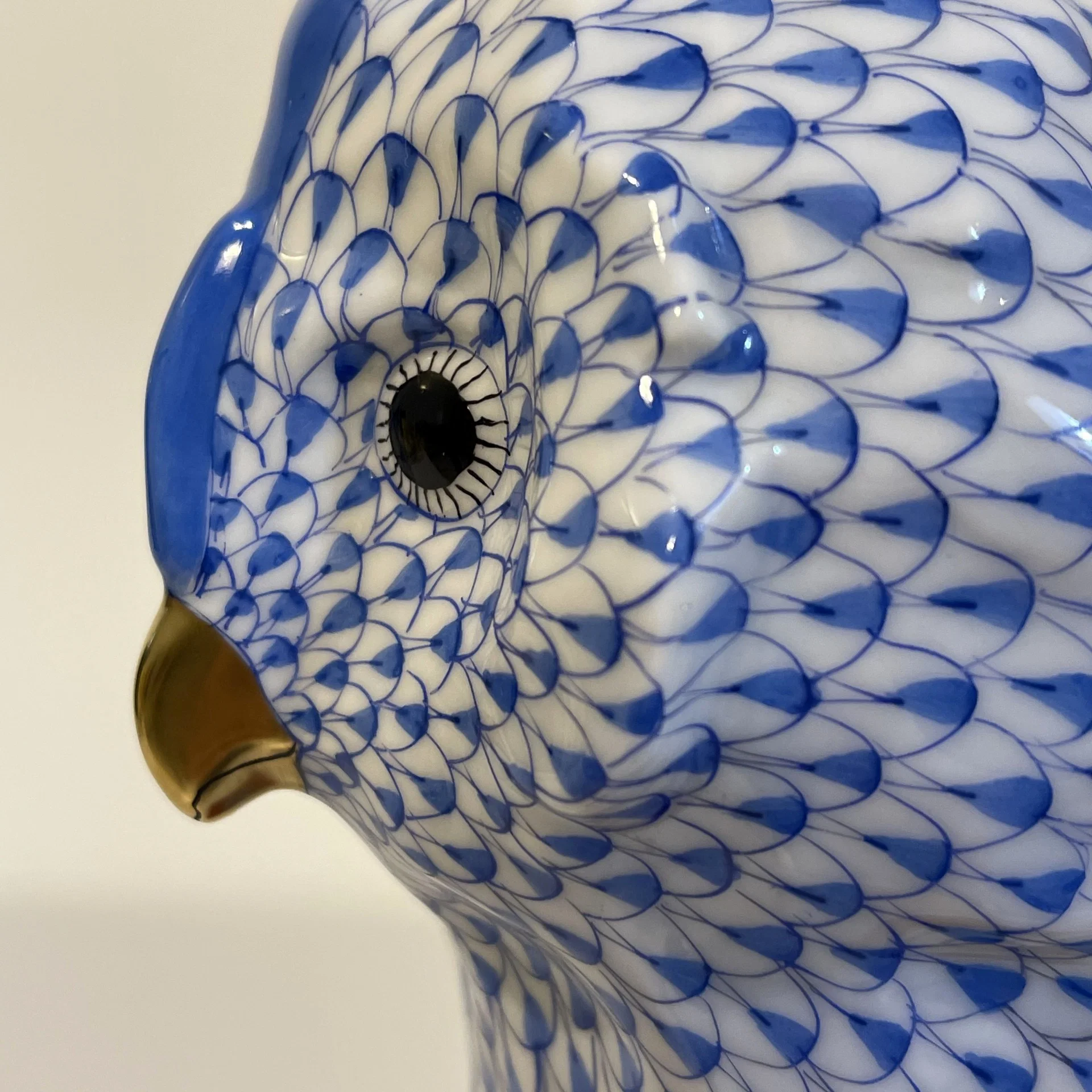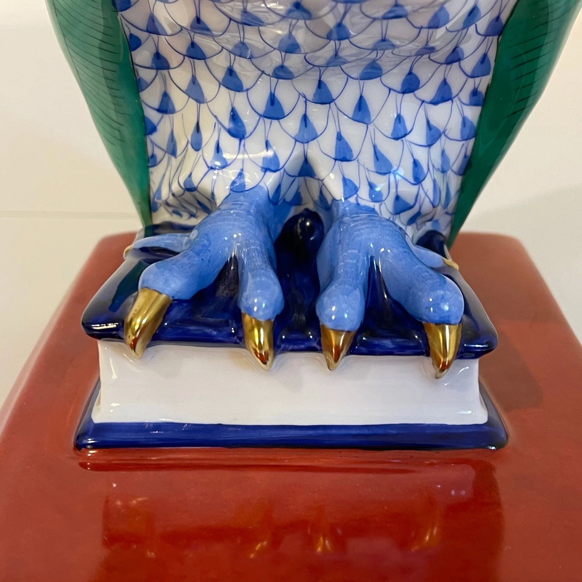 La scultura è interamente dipinta a mano come sottolineato anche nel marchio “Hand-painted” e finemente dorata in corrispondenza del becco e degli arti. Di raffinata esecuzione risulta il piumaggio, minuziosamente dipinto con certosini tocchi di pennellette blu su fondo bianco.