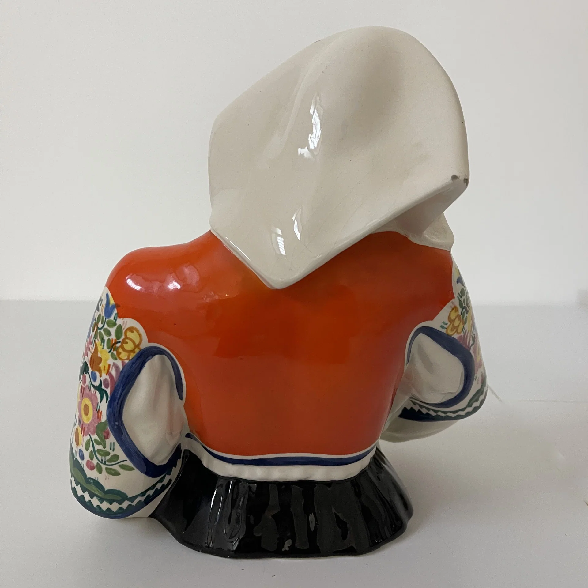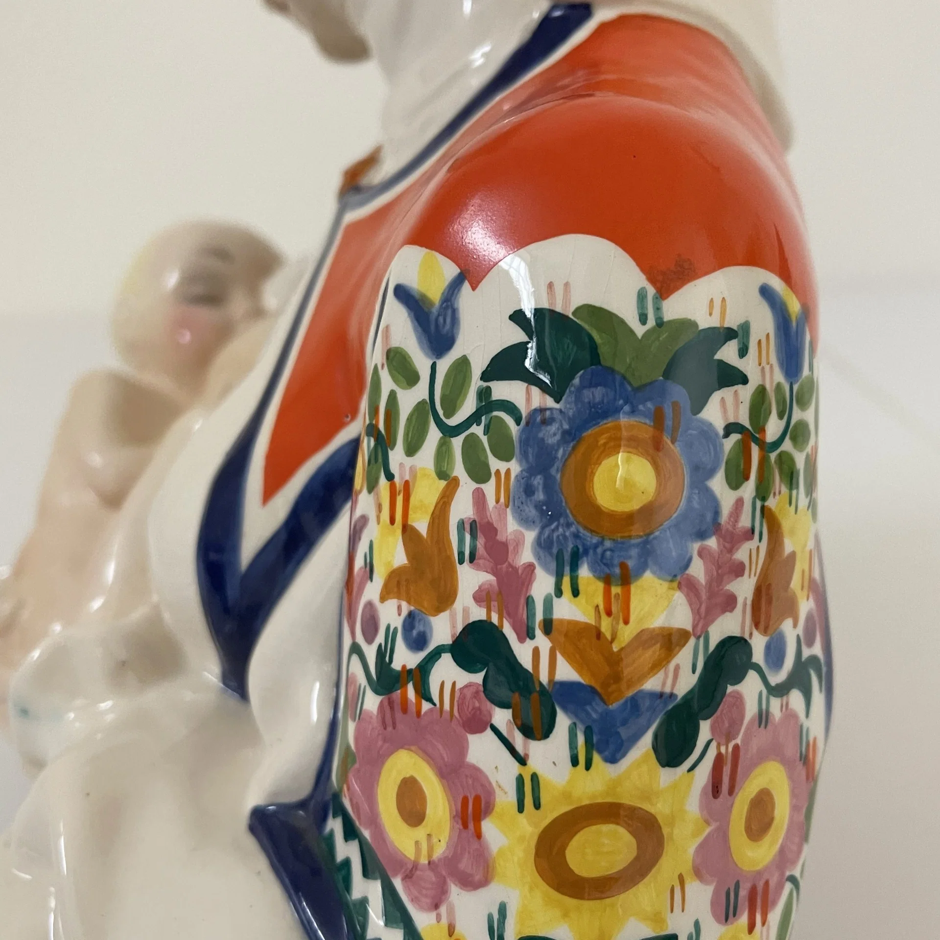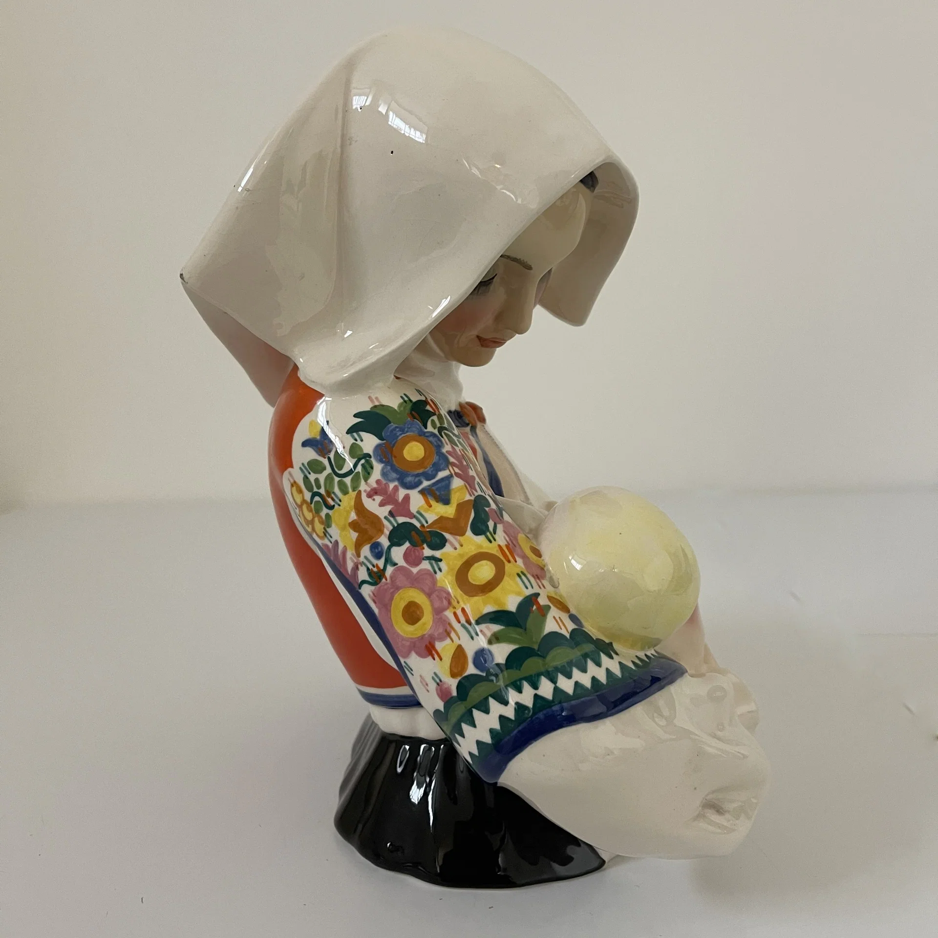 Scultura intitolata “La Maternità sarda” raffigurante un busto di donna intenta ad allattare il suo bambino, opera realizzata in ceramica dipinta a mano in policromia su disegno di Sandro Vacchetti per la manifattura Essevi, Torino, 1930-1940.