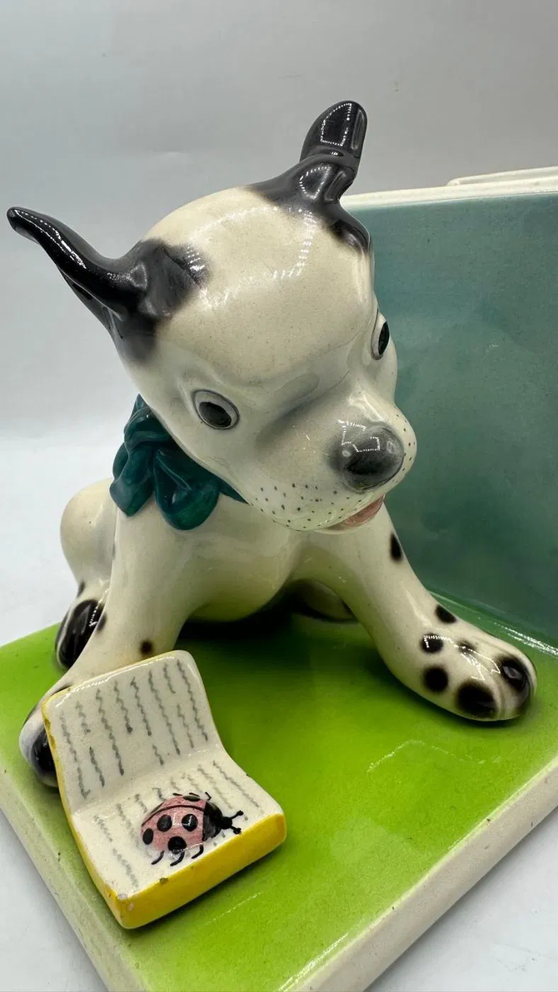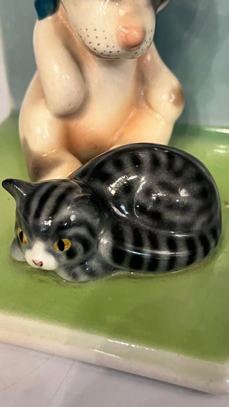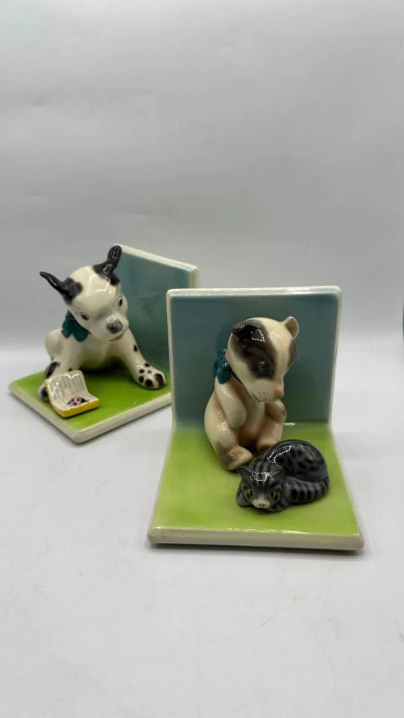 Le figure rappresentano dolci cagnolini con fiocco e un grazioso gattino su base verde con sfondo azzurro e un cagnolino vianco a macchie nere con fiocco al collo raffigurato in atteggiamento giocoso su base verde, un libro giallo con una coccinella sopra e uno sfondo azzurro.