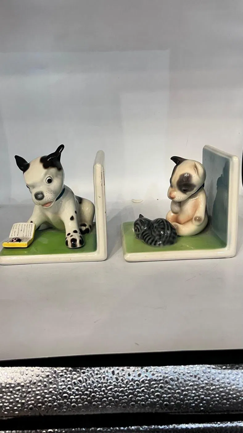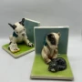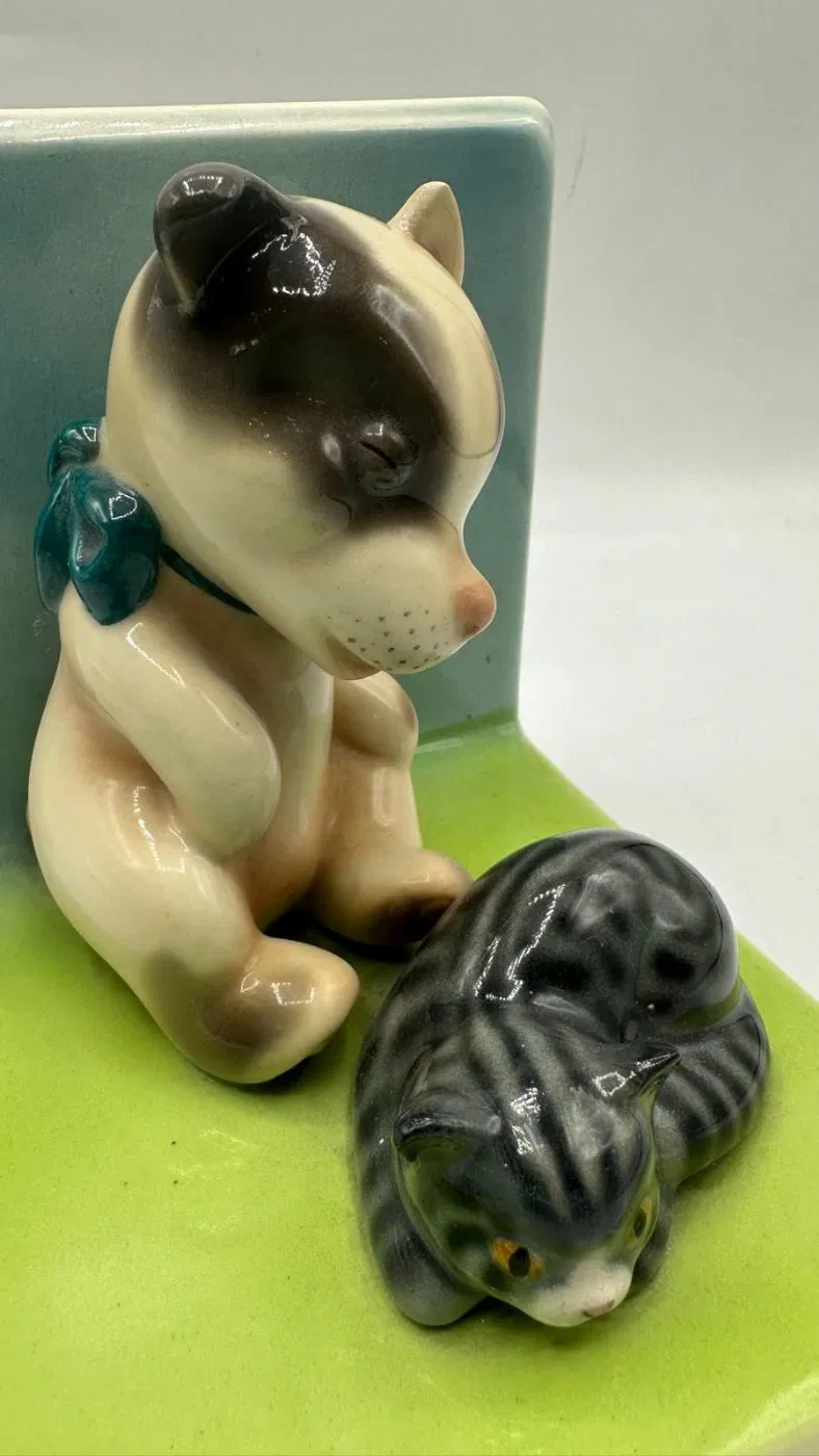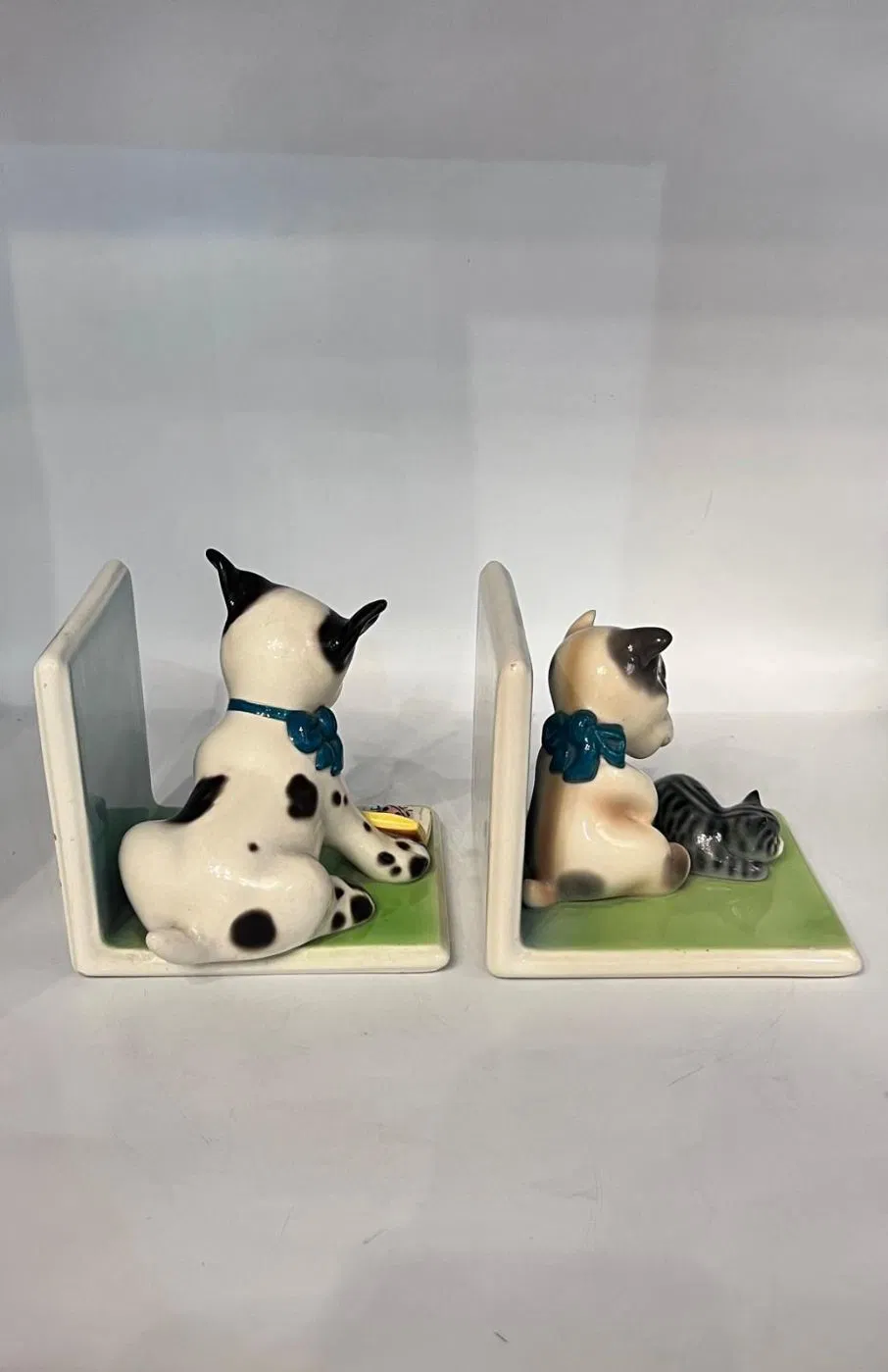 Le figure rappresentano dolci cagnolini con fiocco e un grazioso gattino su base verde con sfondo azzurro e un cagnolino vianco a macchie nere con fiocco al collo raffigurato in atteggiamento giocoso su base verde, un libro giallo con una coccinella sopra e uno sfondo azzurro.