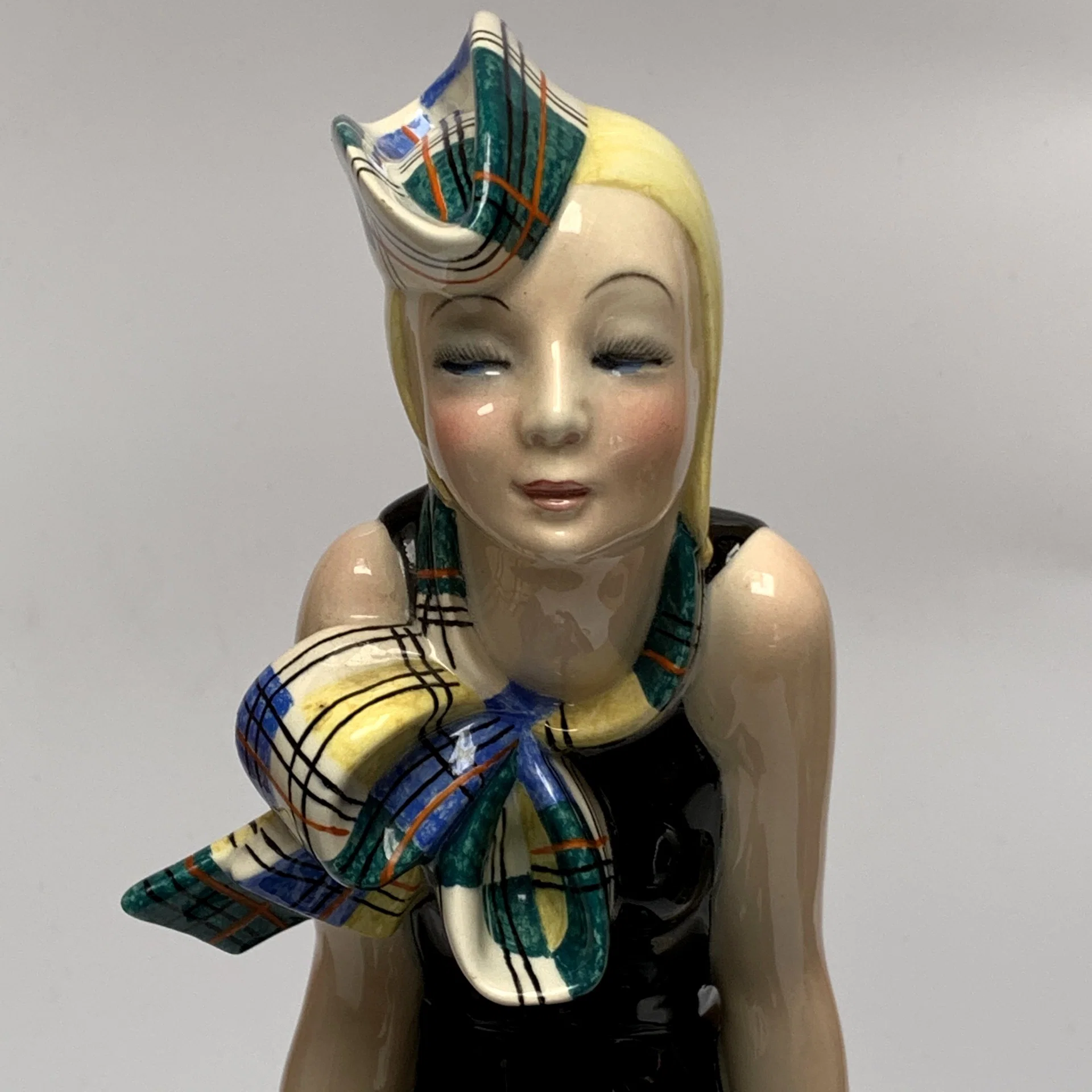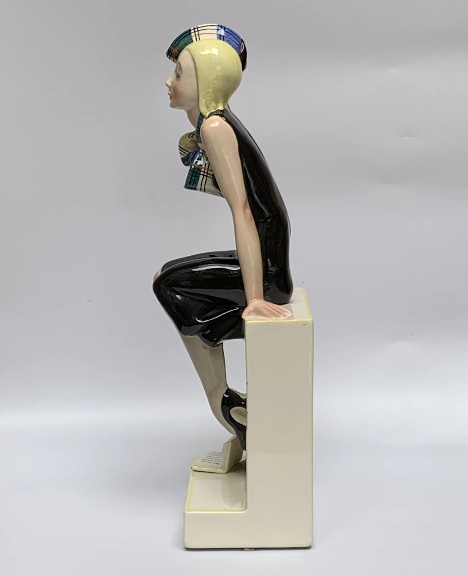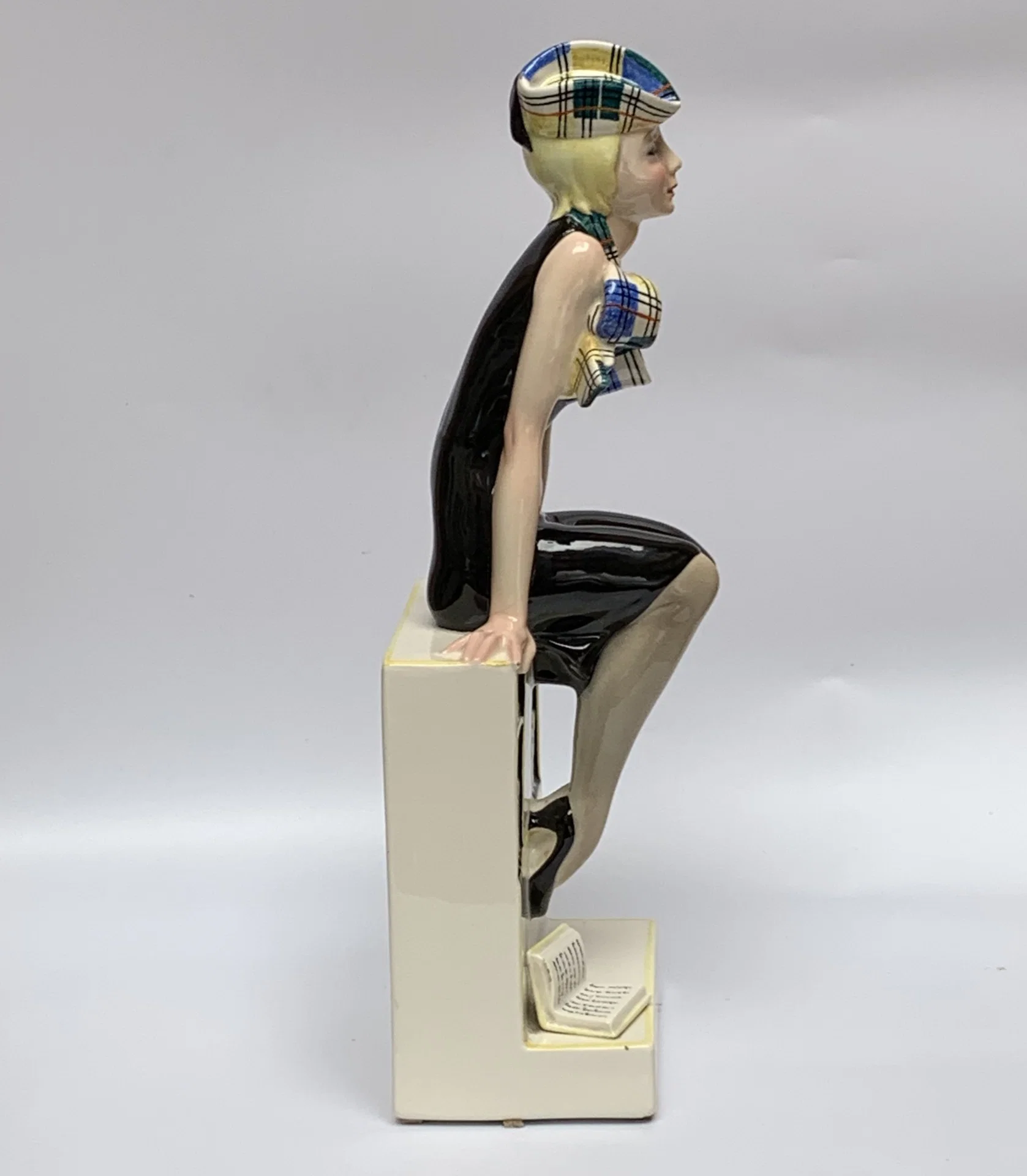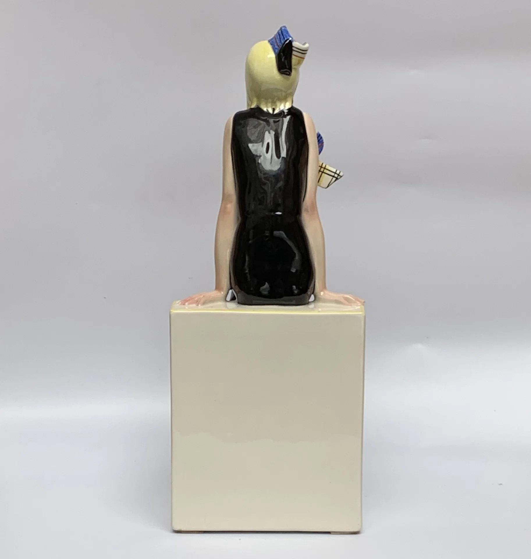 Rara scultura in ceramica decorata a mano in policromia, produzione LENCI su disegno di Helen Konig SCAVINI (1886-1974 ) intitolata “Me ne infischio – La studentessa”, datata 1933.
