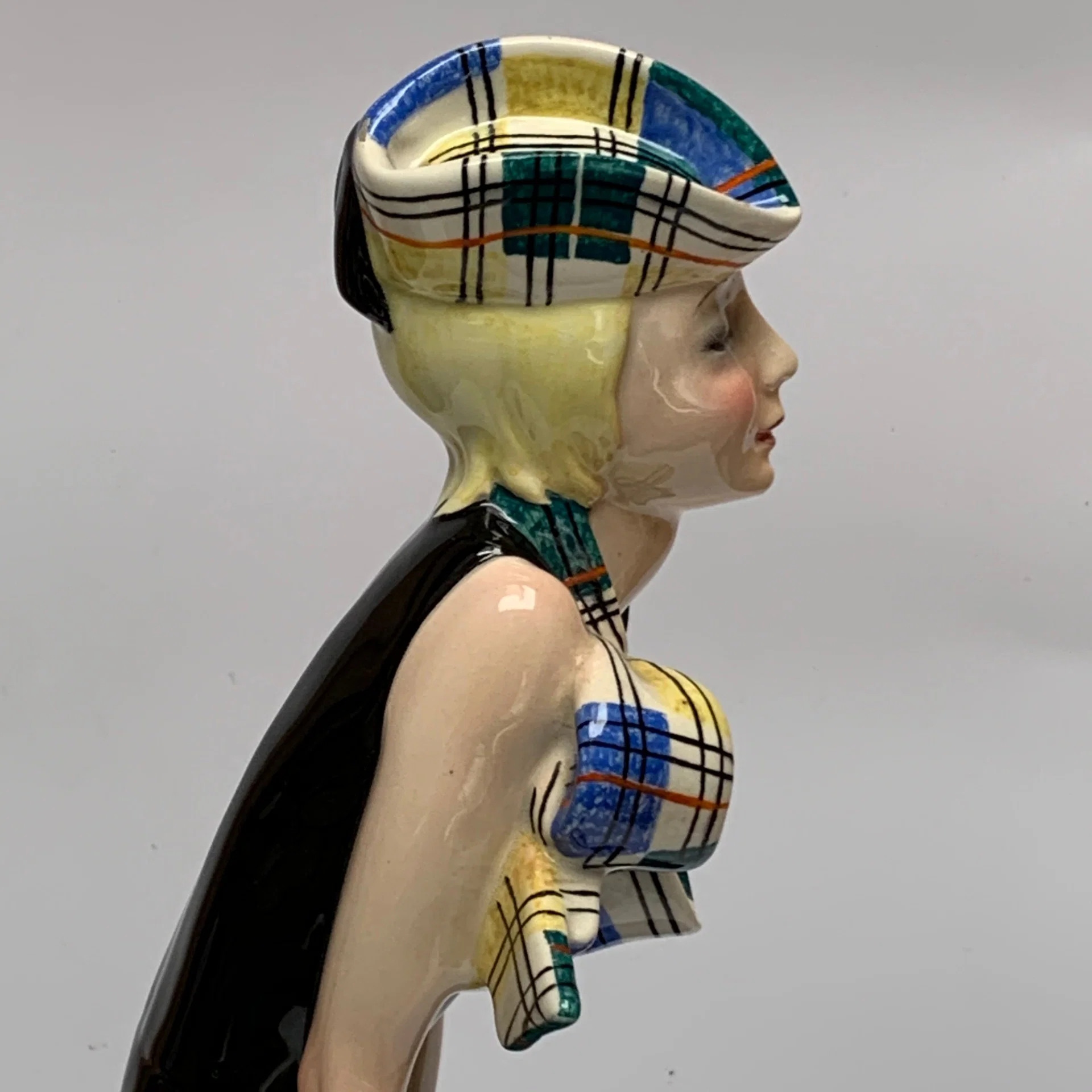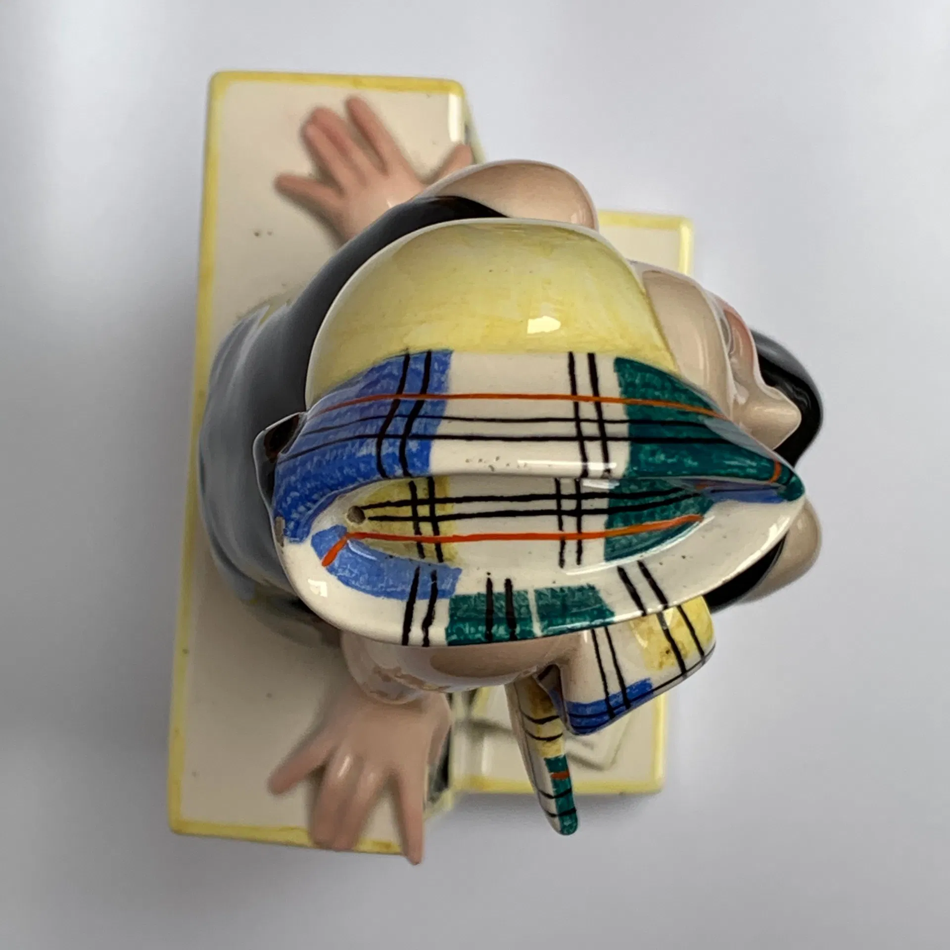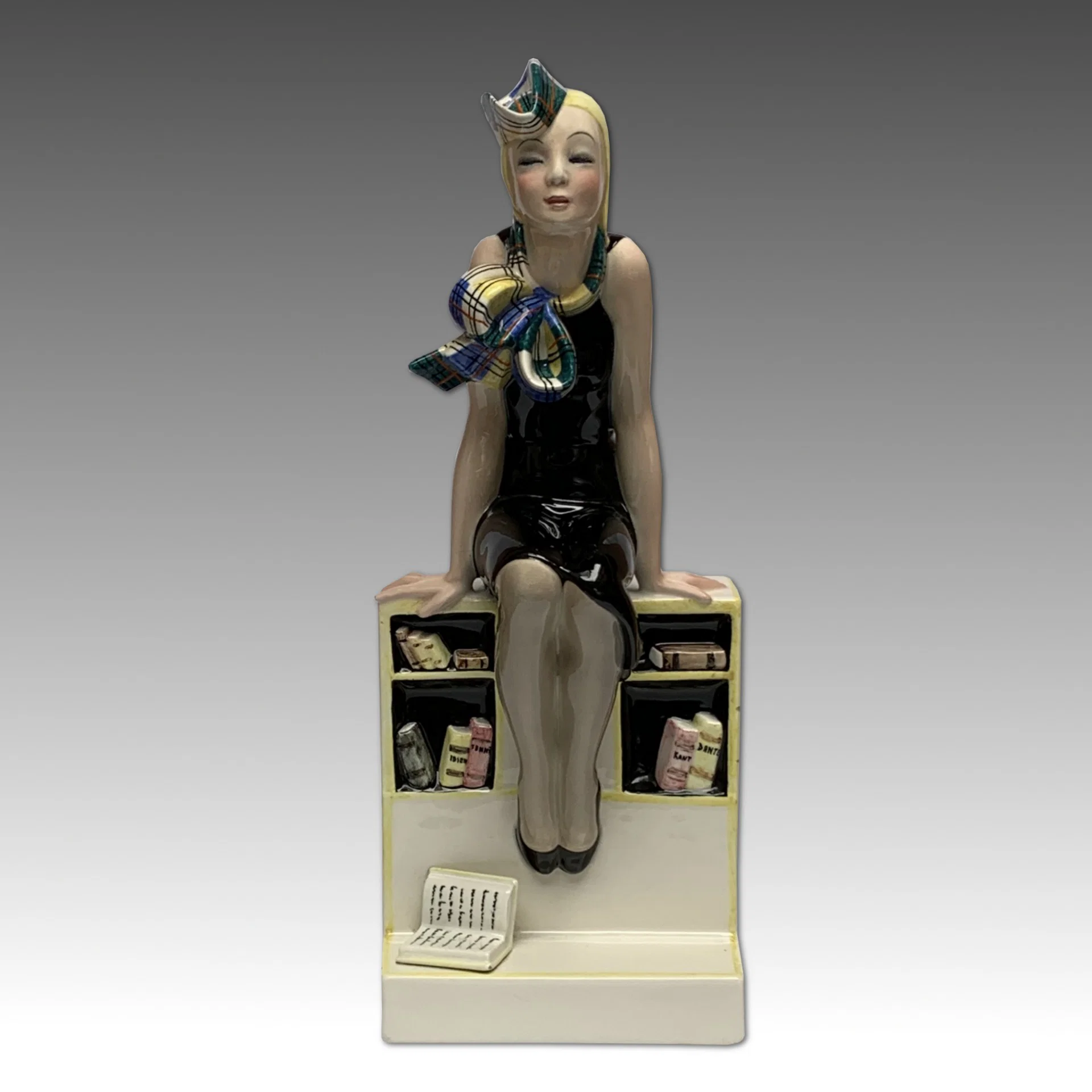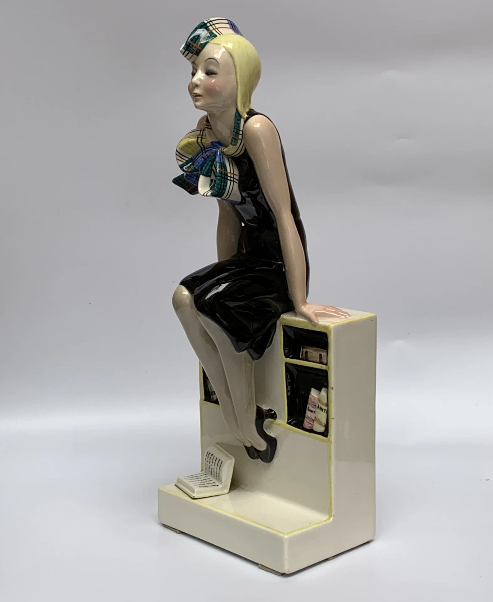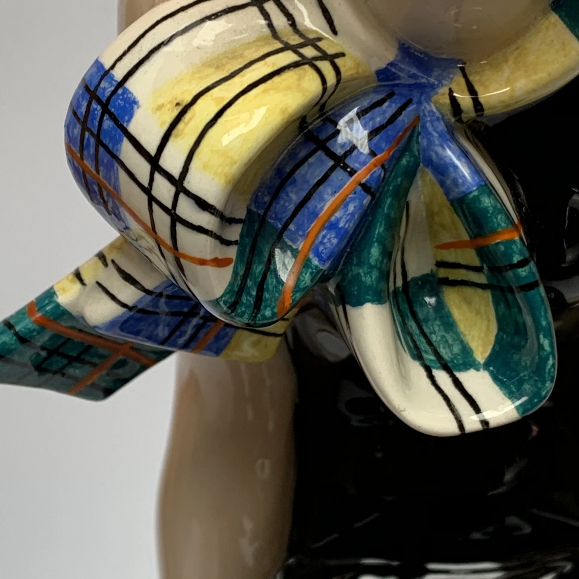 Rara scultura in ceramica decorata a mano in policromia, produzione LENCI su disegno di Helen Konig SCAVINI (1886-1974 ) intitolata “Me ne infischio – La studentessa”, datata 1933.