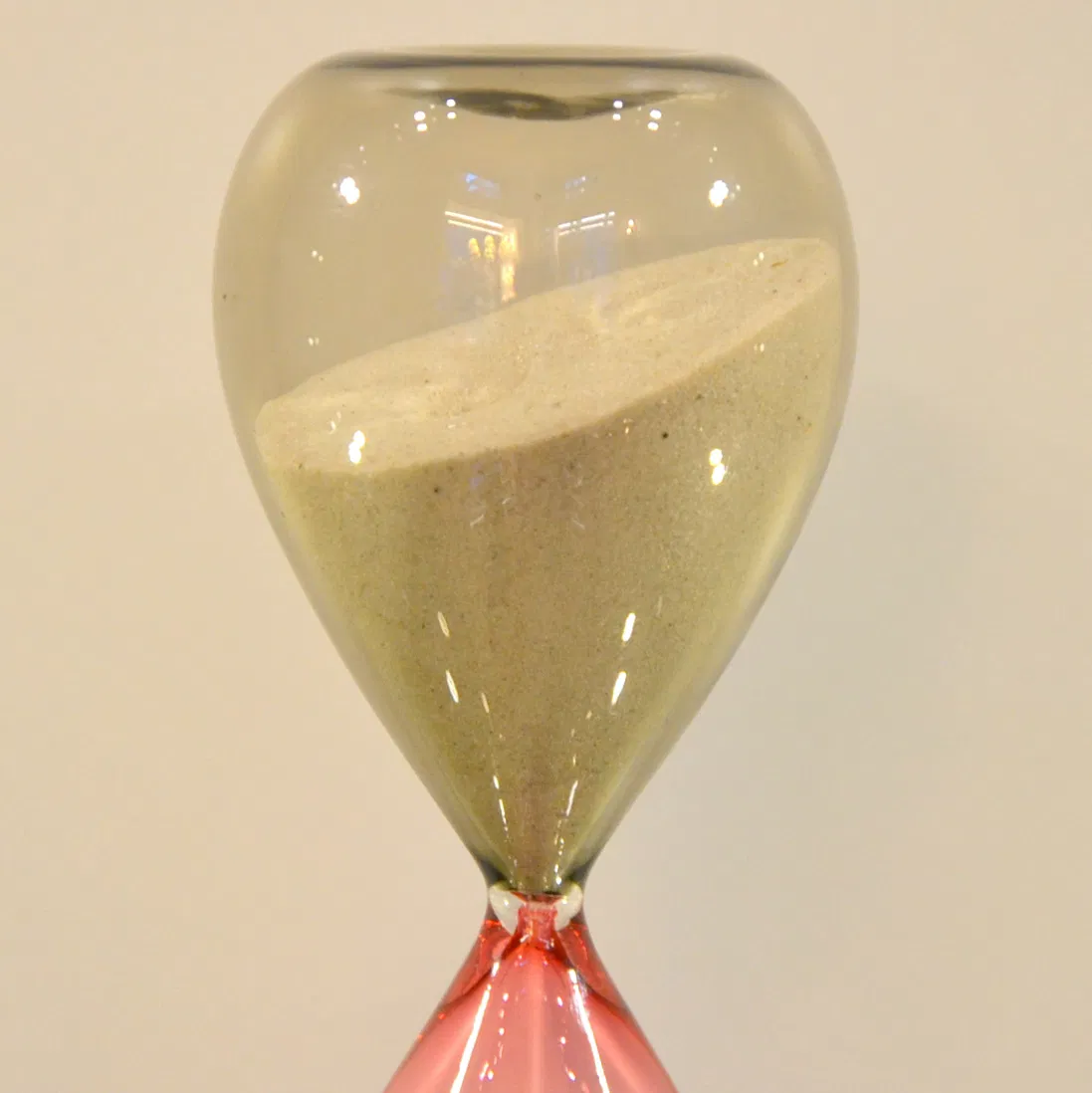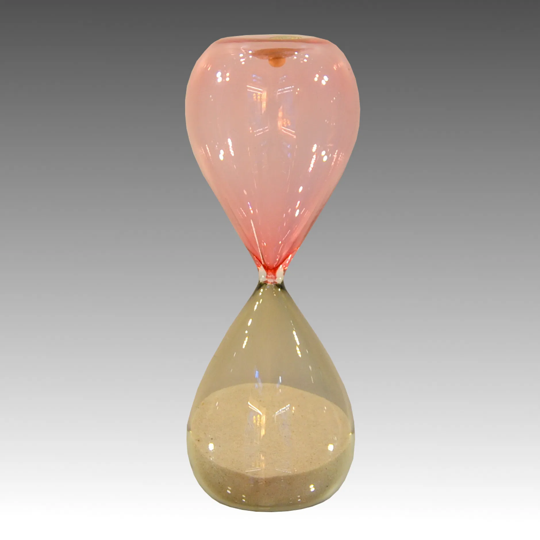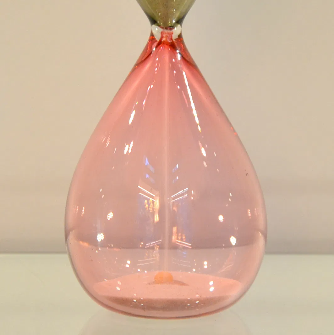 Clessidra in vetro soffiato Venini progettata da Paolo Venini e Fulvio Bianconi probabilmente nel 1957, caratterizzata dalla tenue colorazione rosa-talpa, colore raro e ormai fuori produzione.