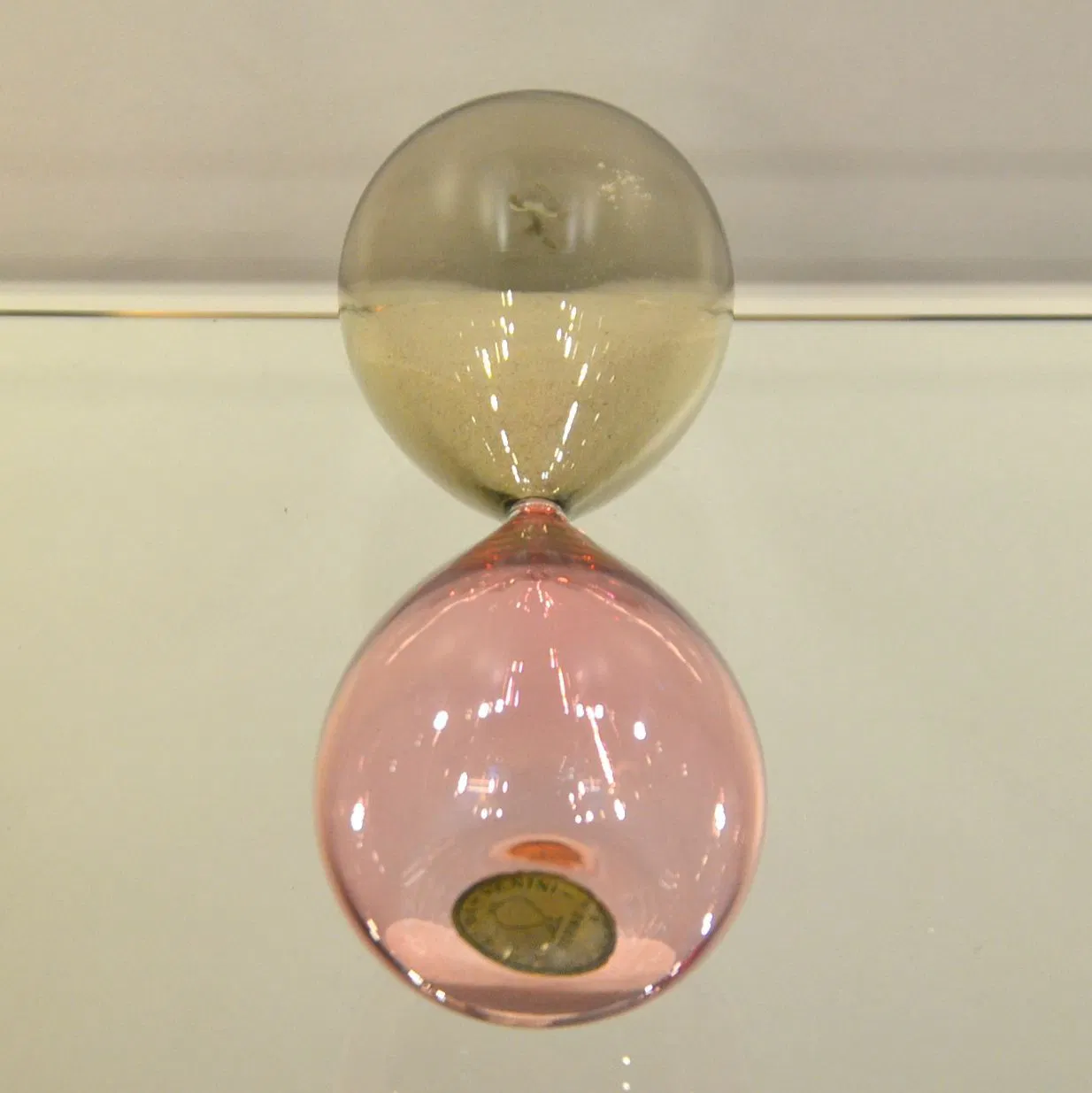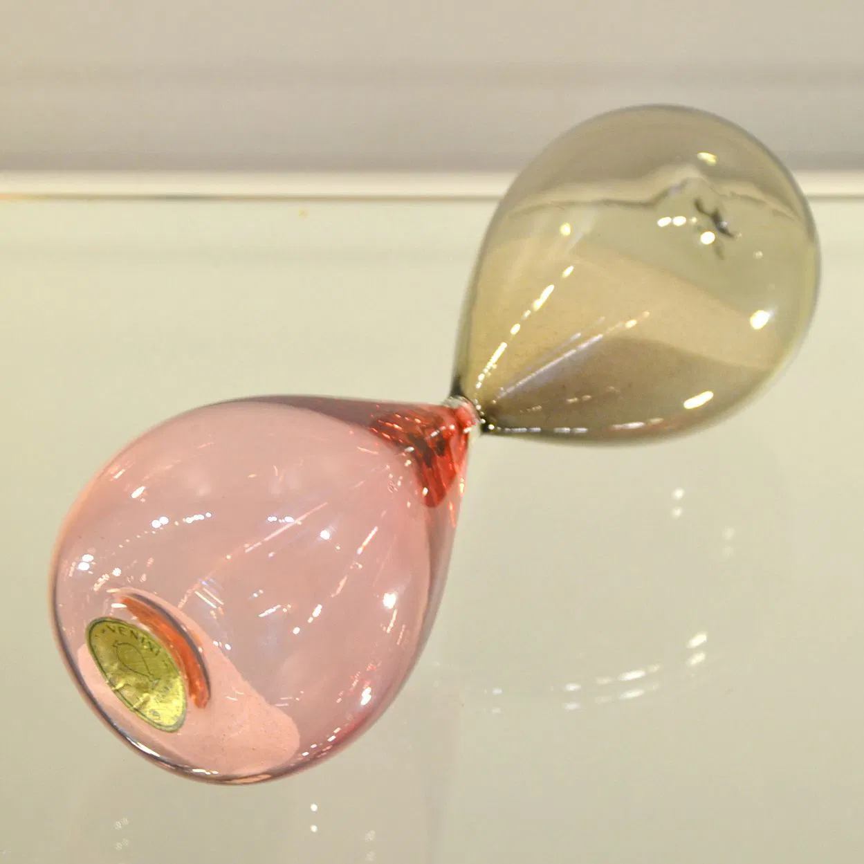 Le clessidre disegnate da Venini e Bianconi nascono nella complessa tecnica vetraria dell’incalmo, tecnica di accostamento di diversi colori di vetro saldati assieme a caldo in modo tale da creare, un unico pezzo soffiato con distinti colori. E’ da sottolineare, e questo avvalora l’oggetto esposto, che solo alcuni colori possono essere uniti con questa tecnica, in quanto ogni colore ha proprie caratteristiche di raffreddamento che, ovviamente, debbono essere compatibili, altrimenti le tensioni diverse finirebbero per rompere l’oggetto creato.