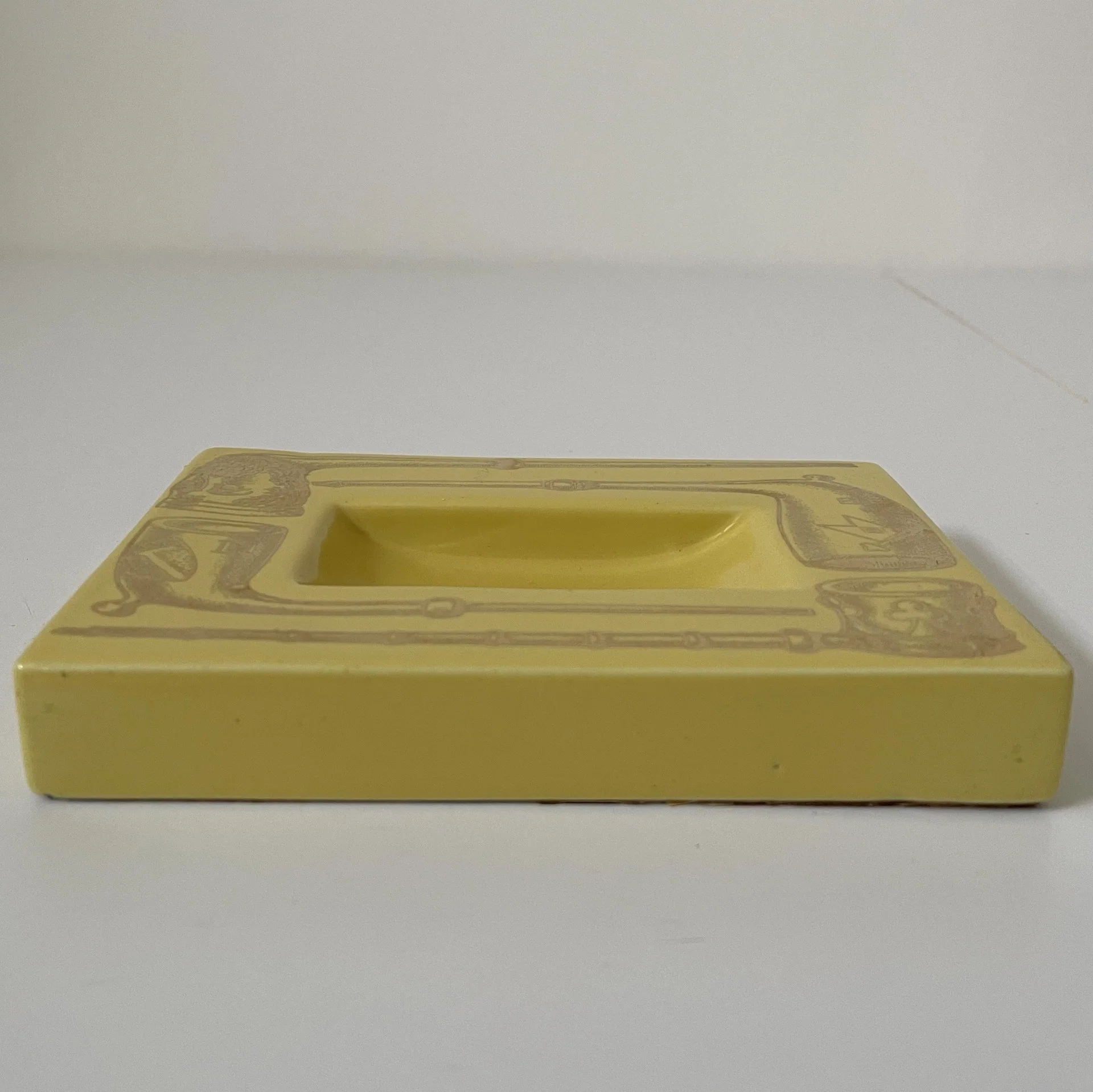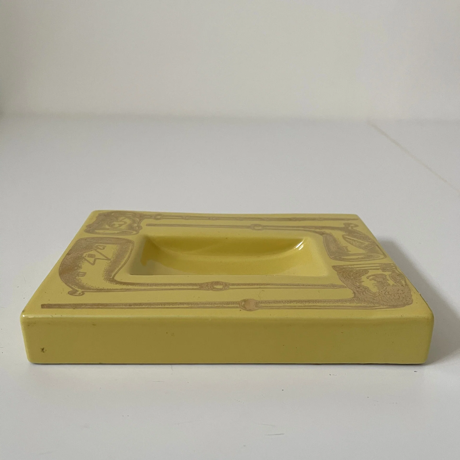 Posacenere della serie “Pipe” in ceramica gialla decorata con serigrafia dorata riproducente le tipiche pipe, Fornasetti, anni ’60.
