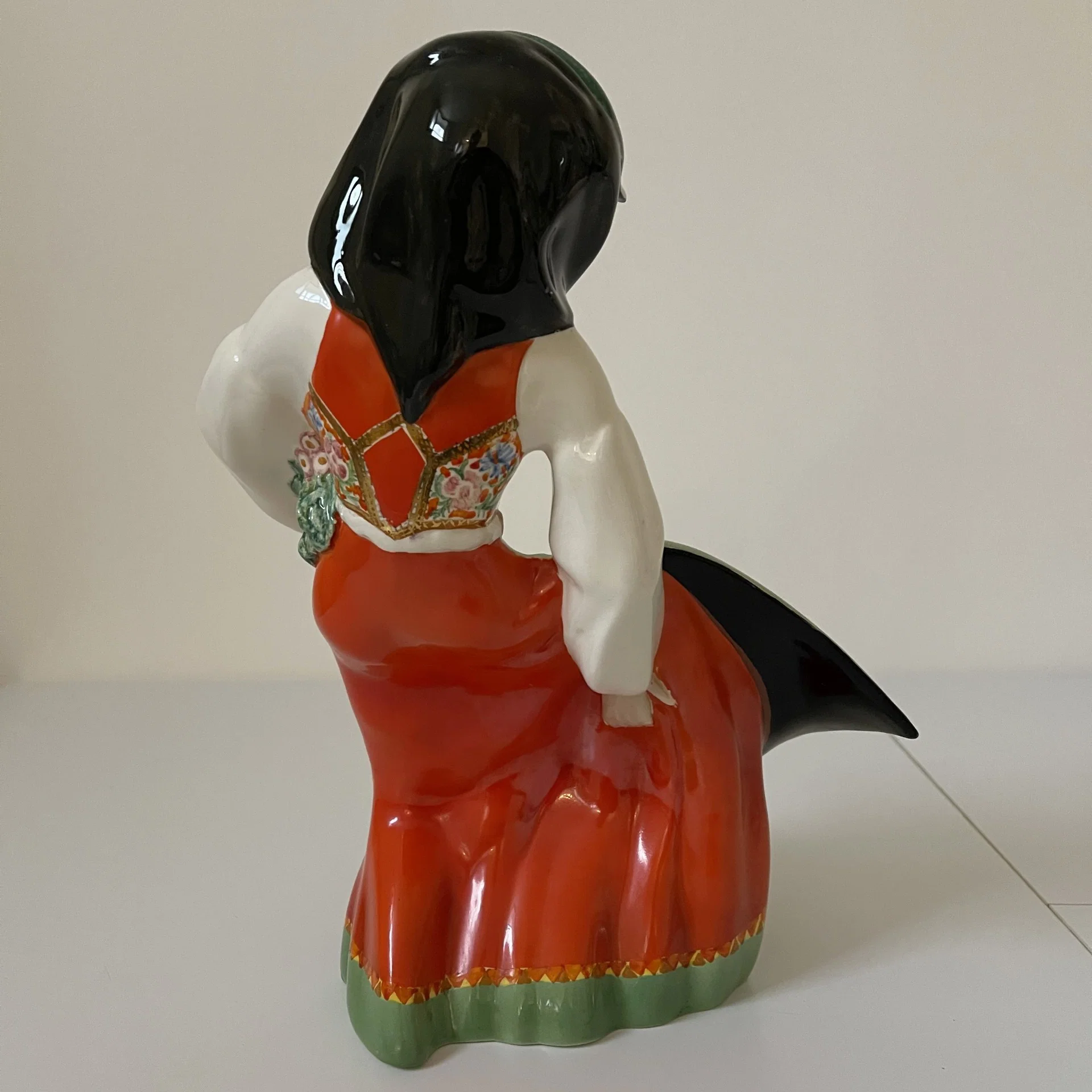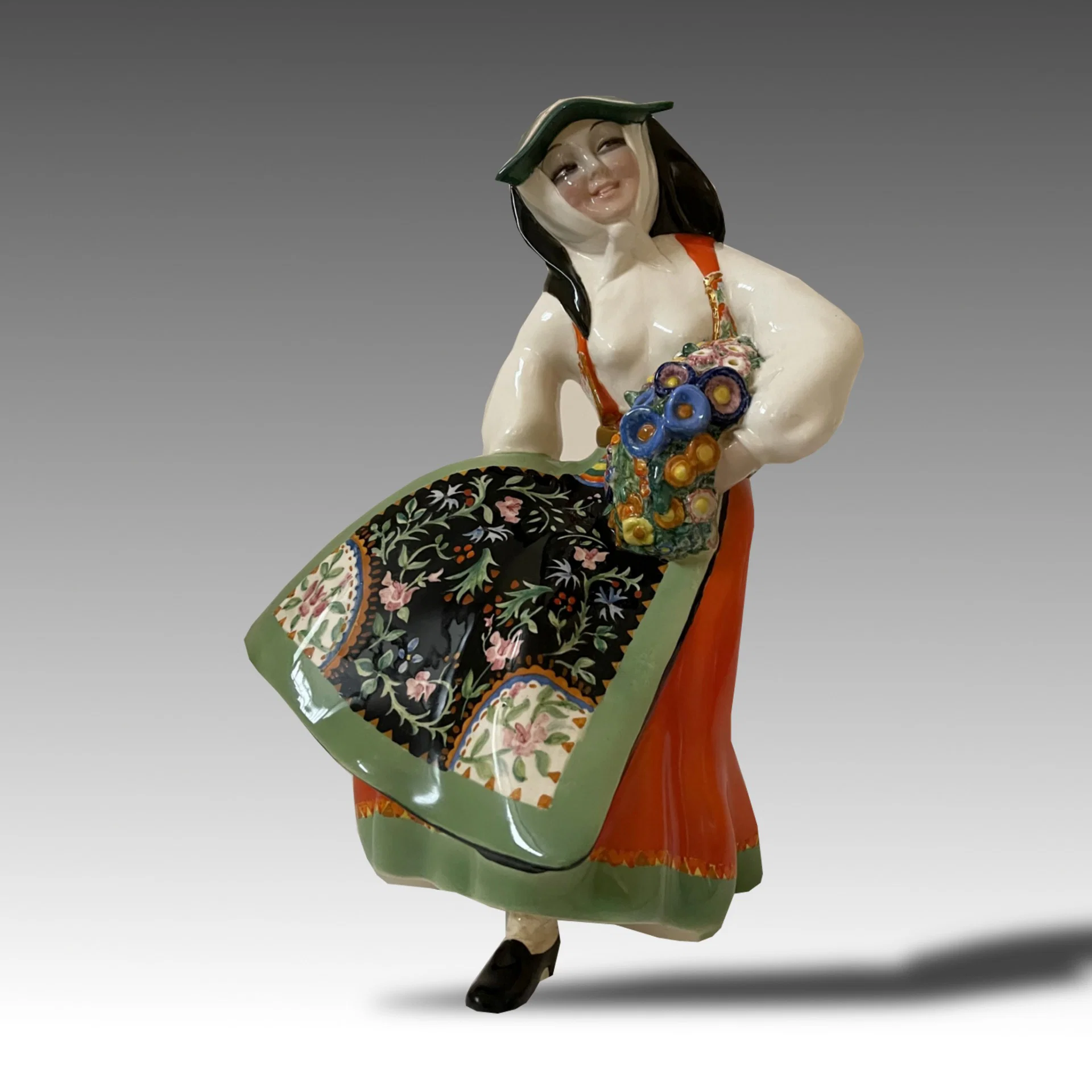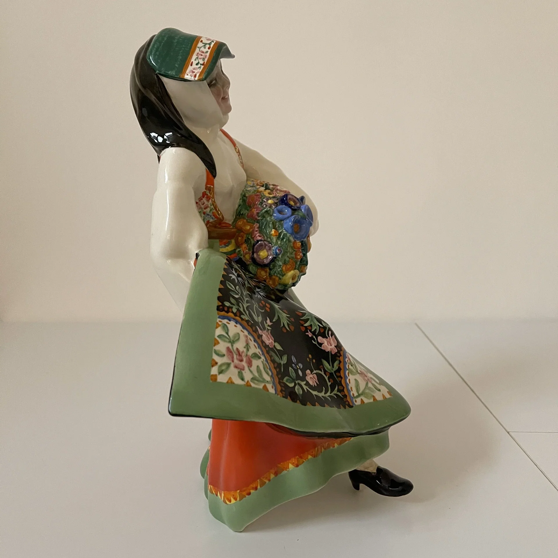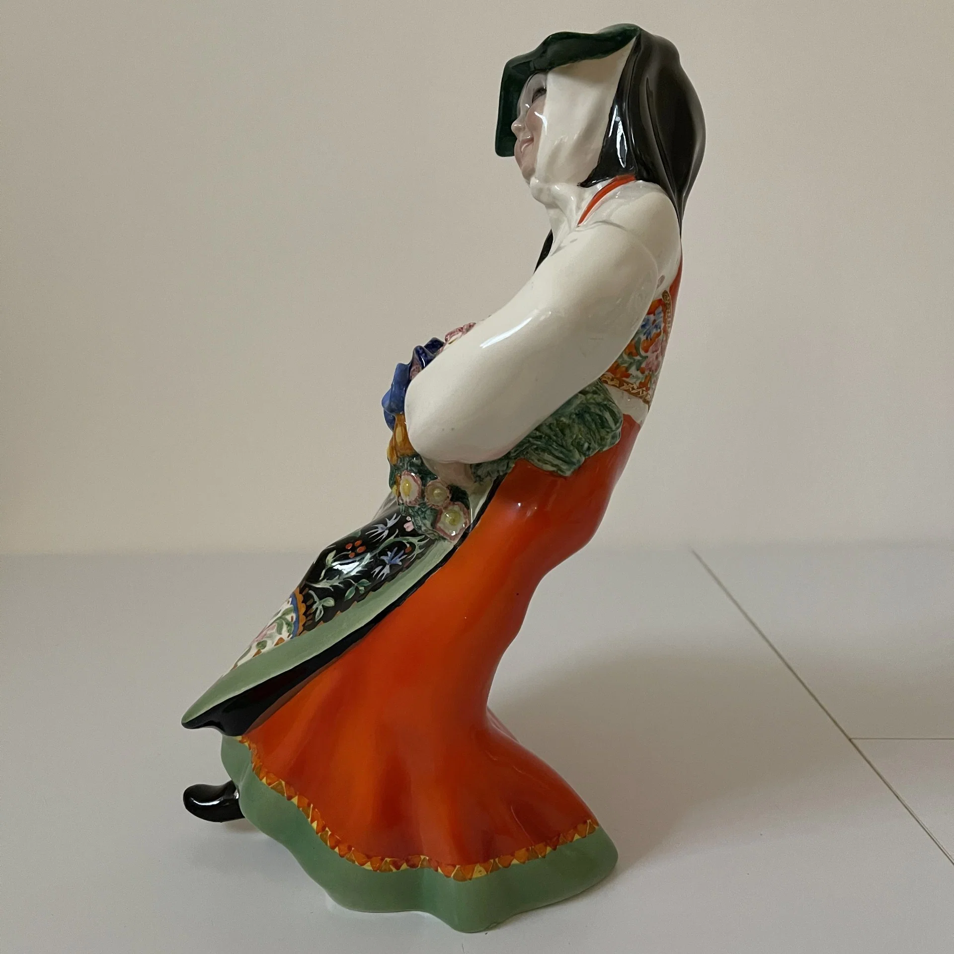 Scultura raffigurante una donna a figura intera abbigliata con costumi trazionali sardi realizzata in ceramica smaltata e dipinta in policromia per la manifattura torinese Essevi, Torino, 1940.
