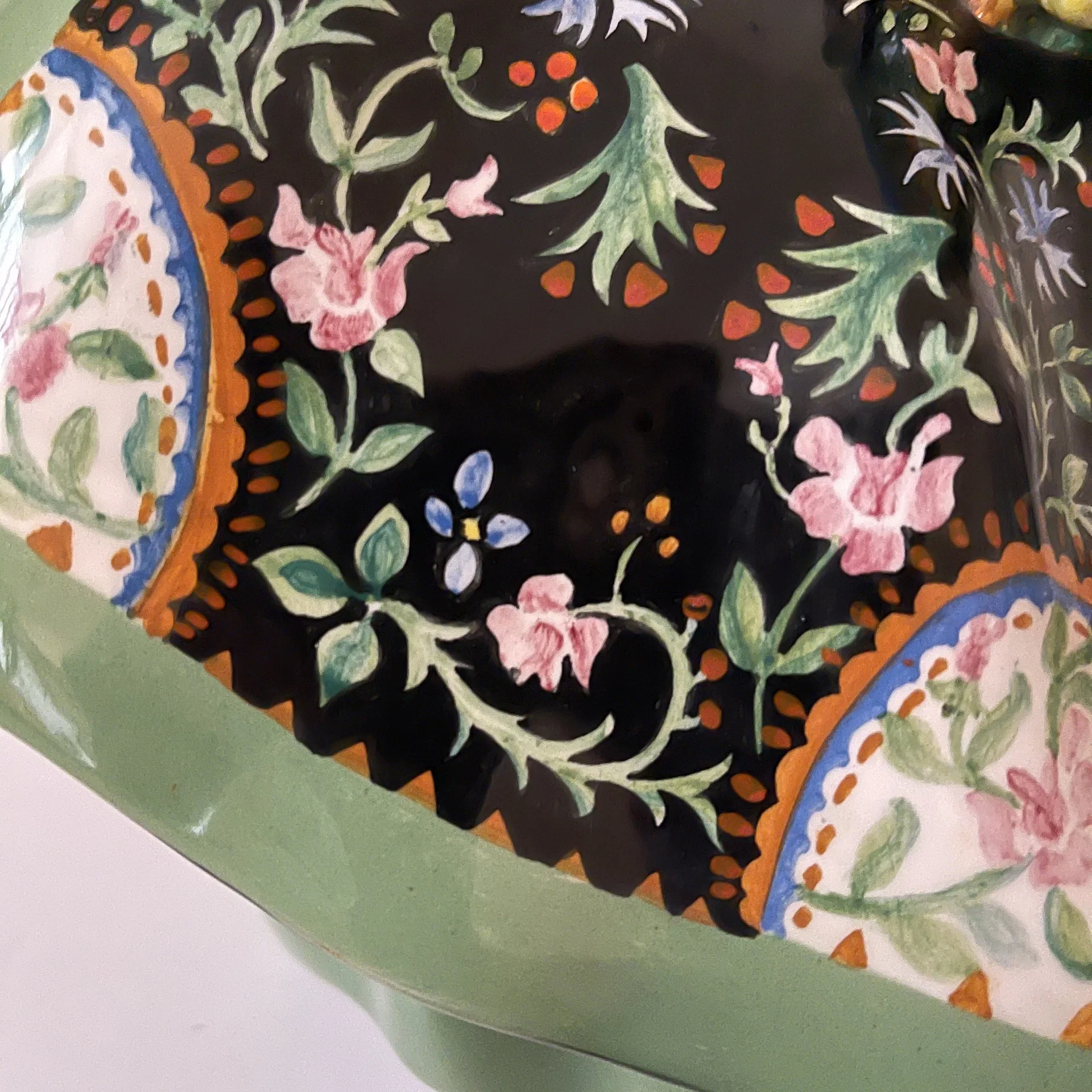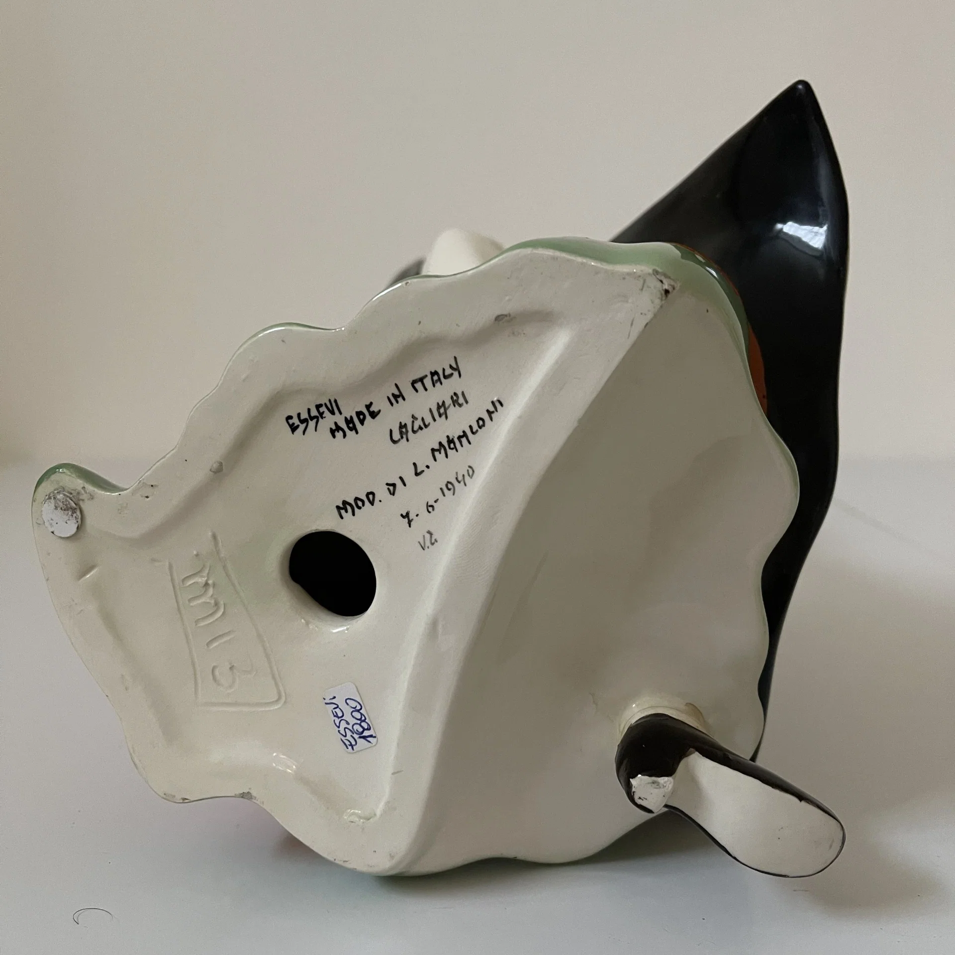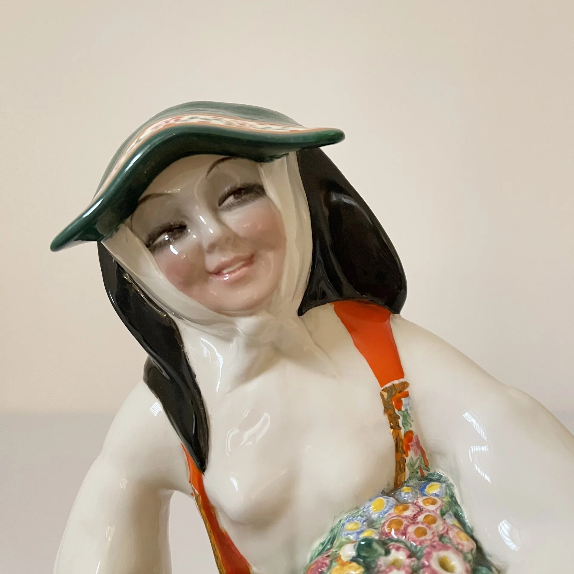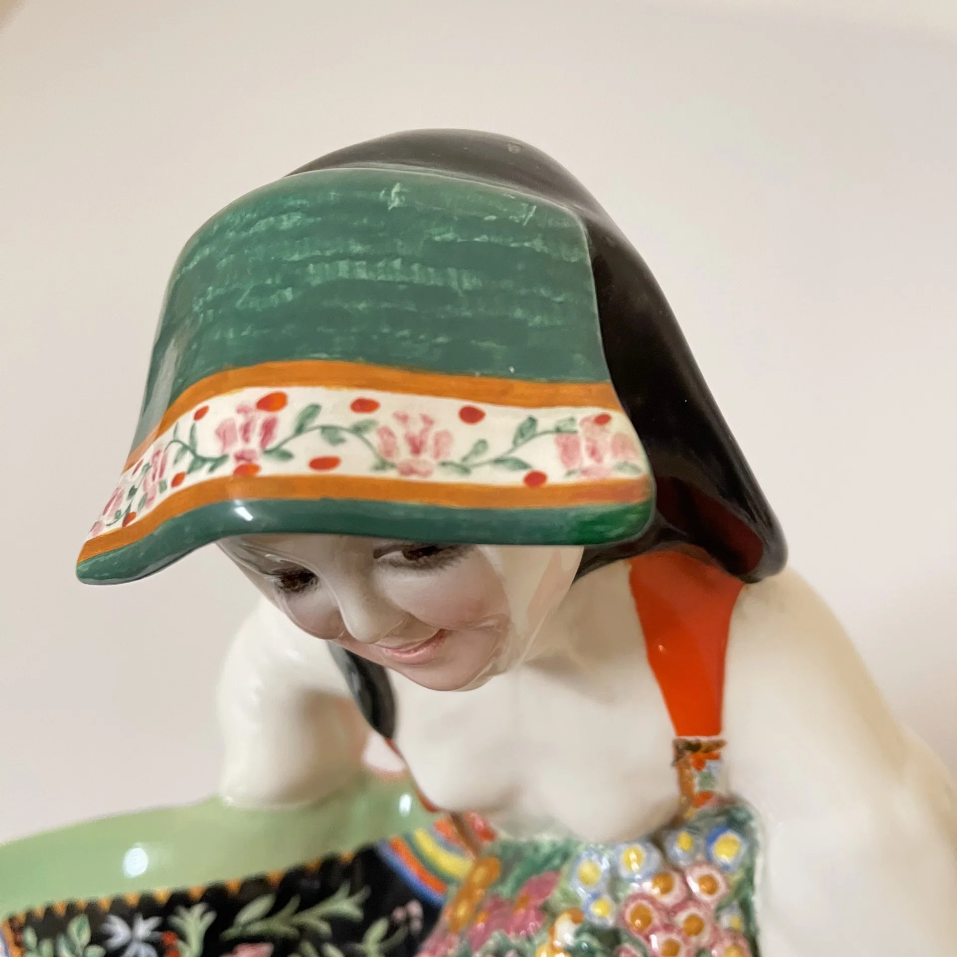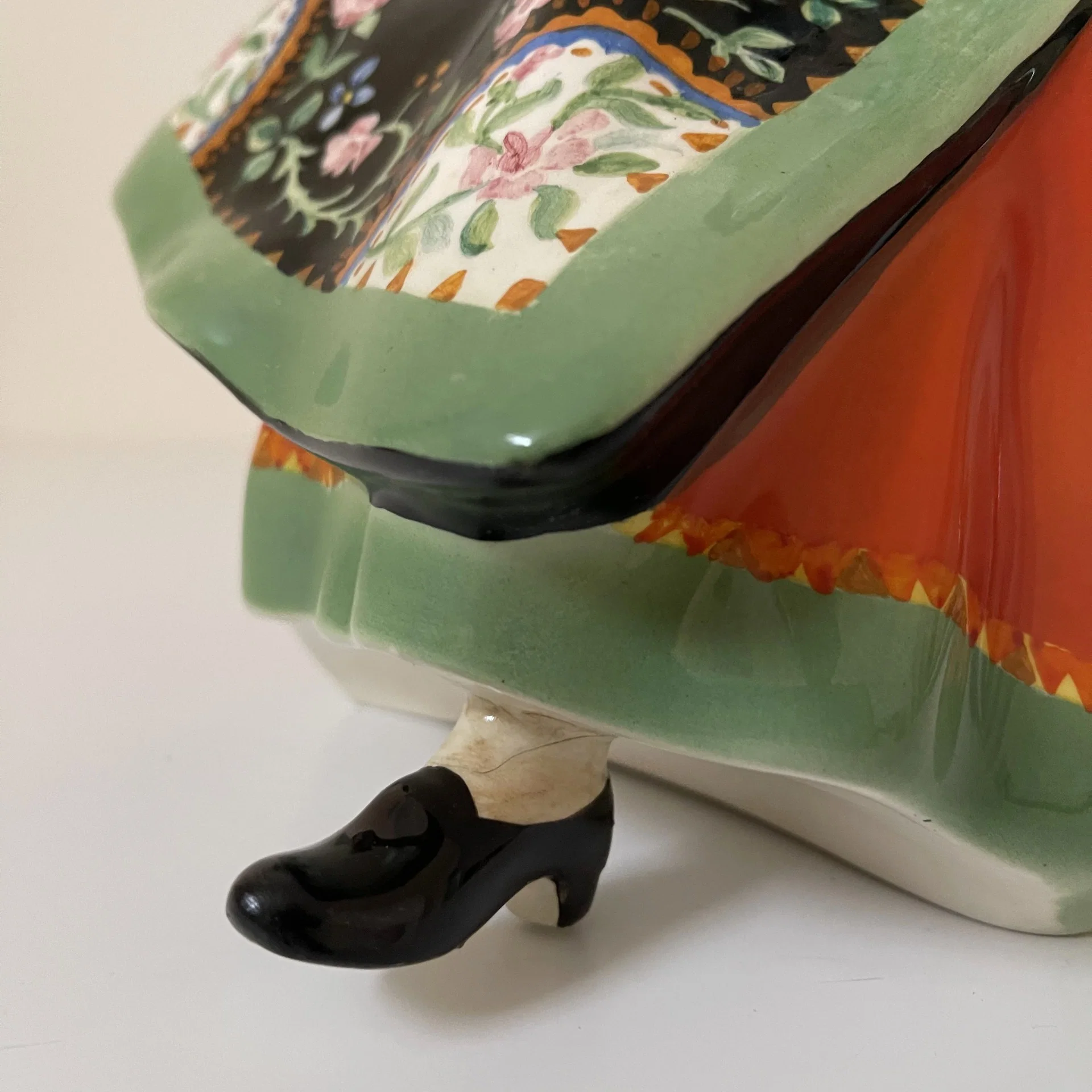 Scultura raffigurante una donna a figura intera abbigliata con costumi trazionali sardi realizzata in ceramica smaltata e dipinta in policromia per la manifattura torinese Essevi, Torino, 1940.