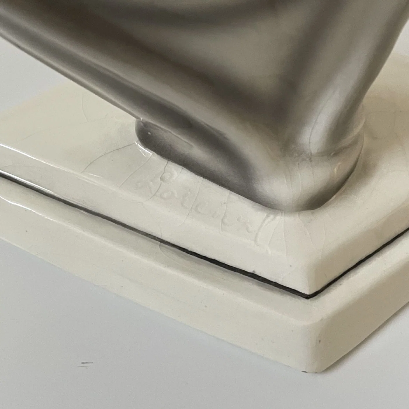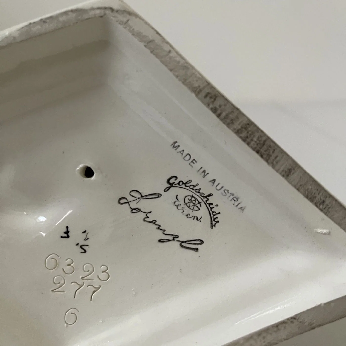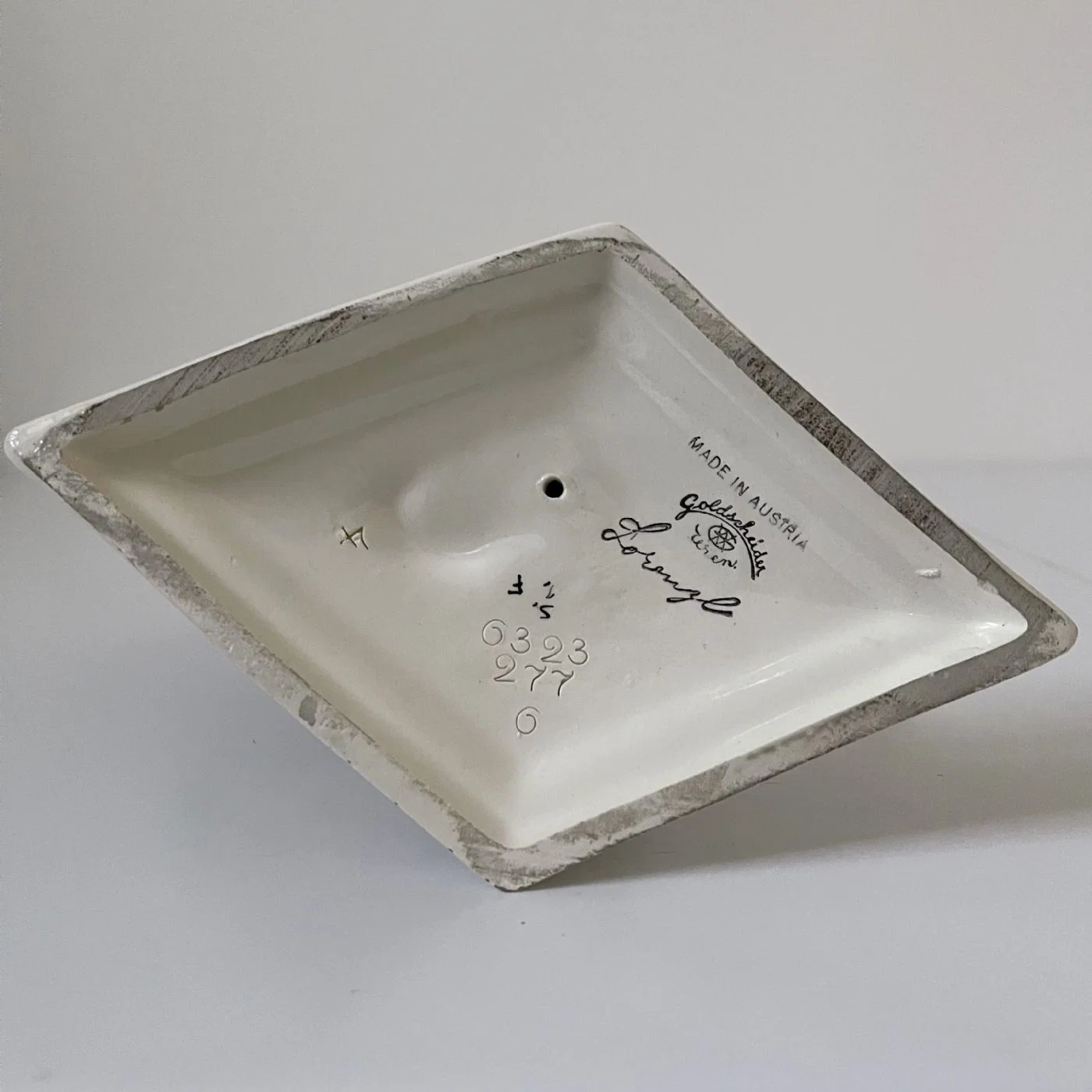 Sotto la base romboidale è presente la firma dipinta in nero “Lorenzl” ed il marchio della manifattura Goldscheider – Made in Austria.