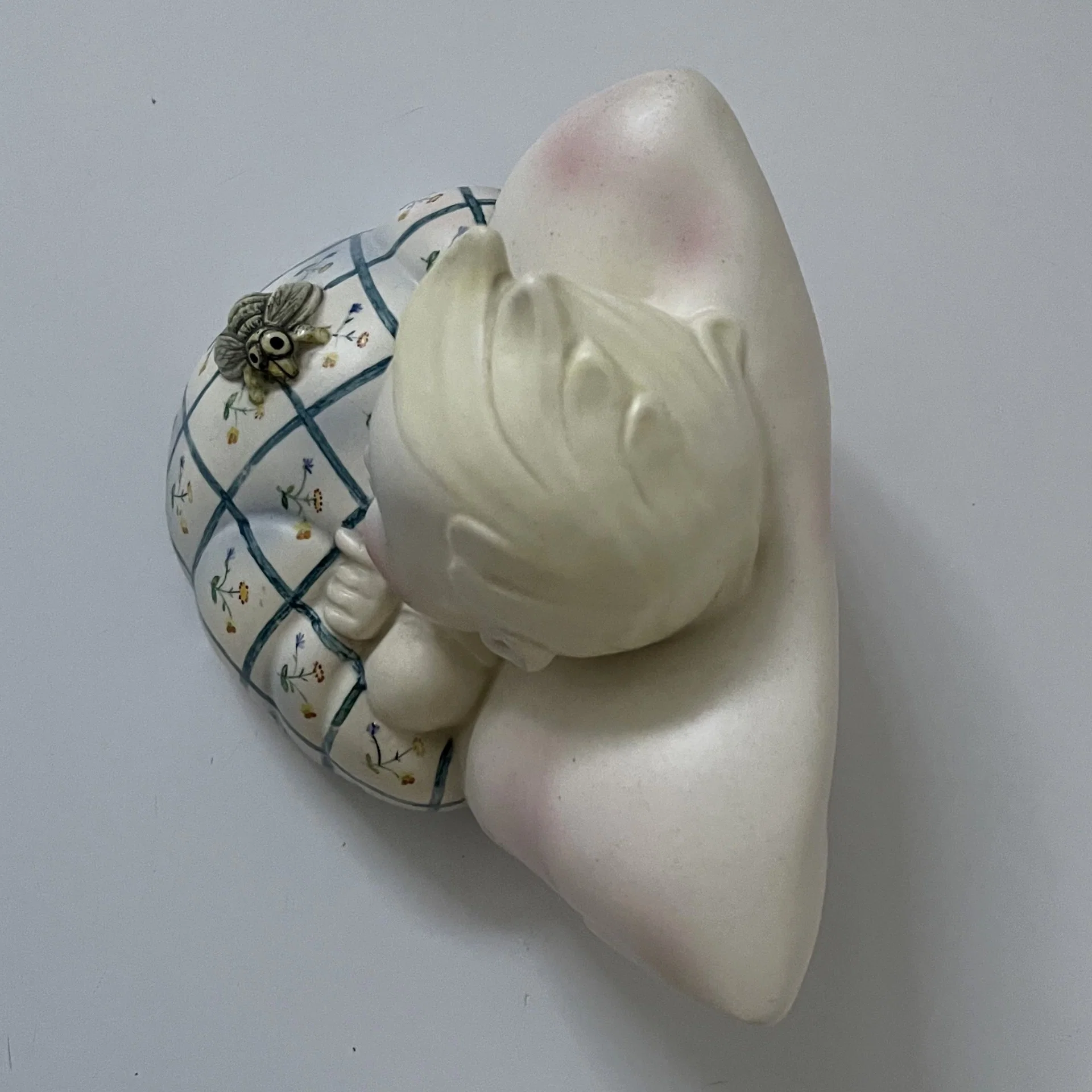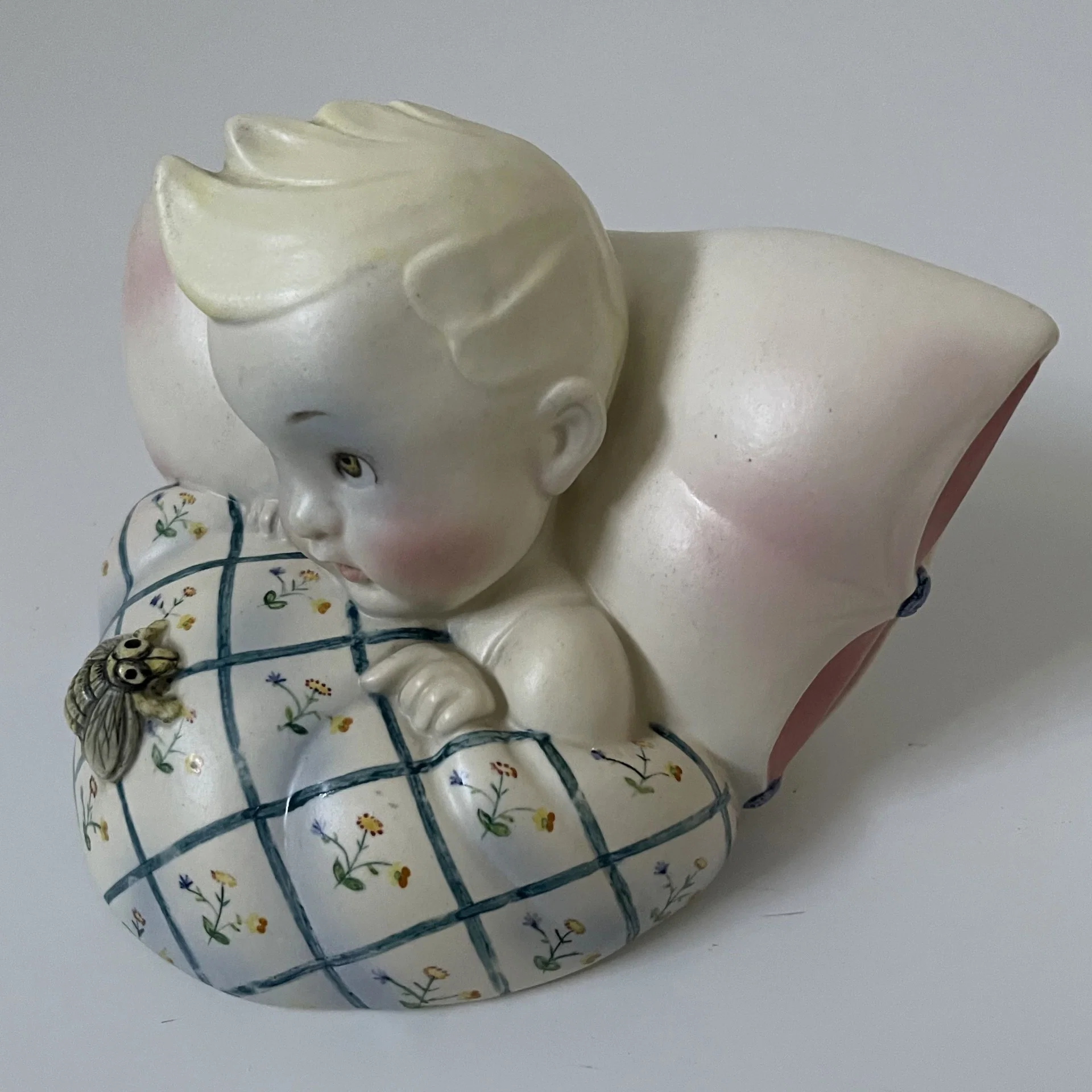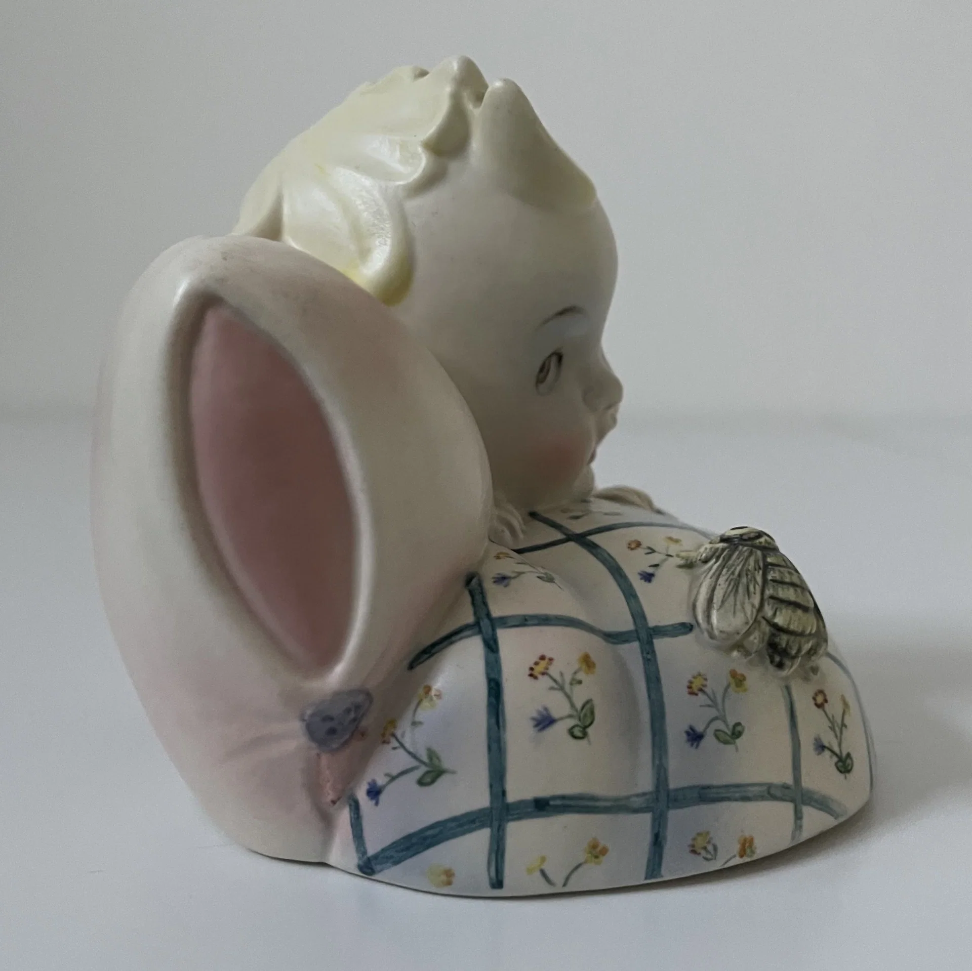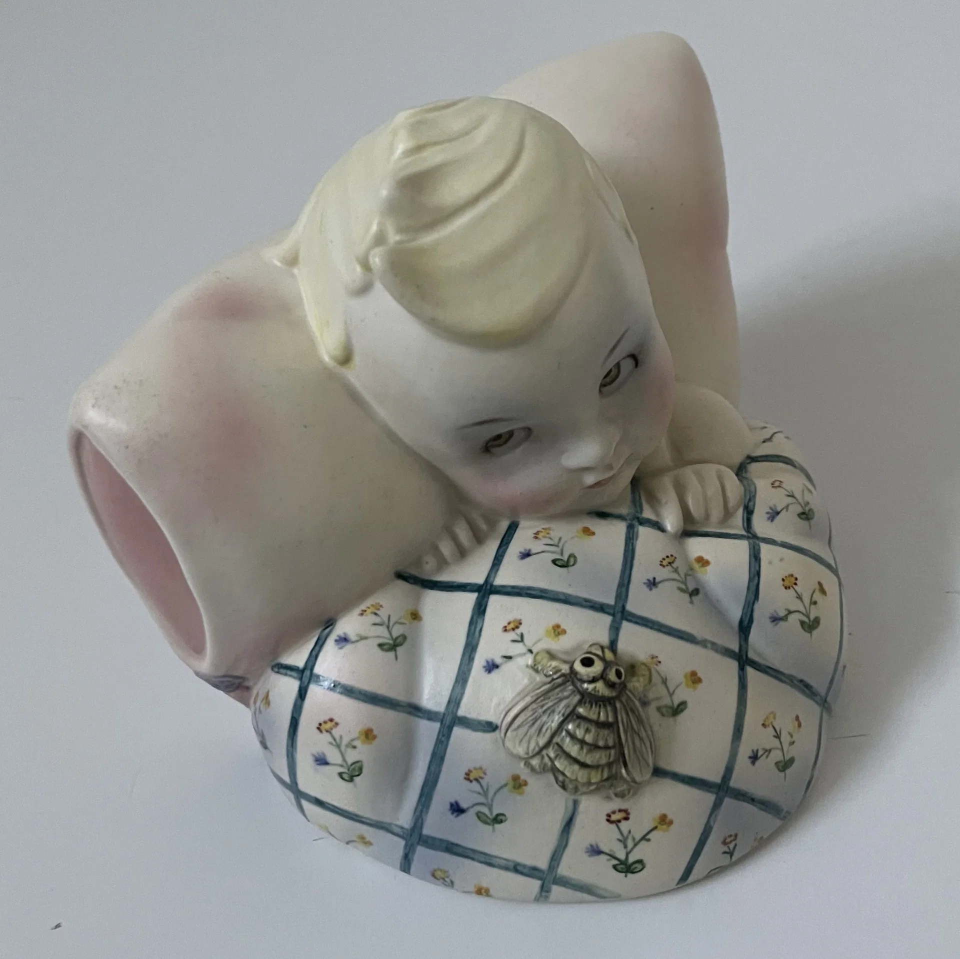 Piccola scultura raffigurante un bambino con la testa appoggiata su un cuscino e con un ape sopra le coperte, manifattura Lenci, Torino.