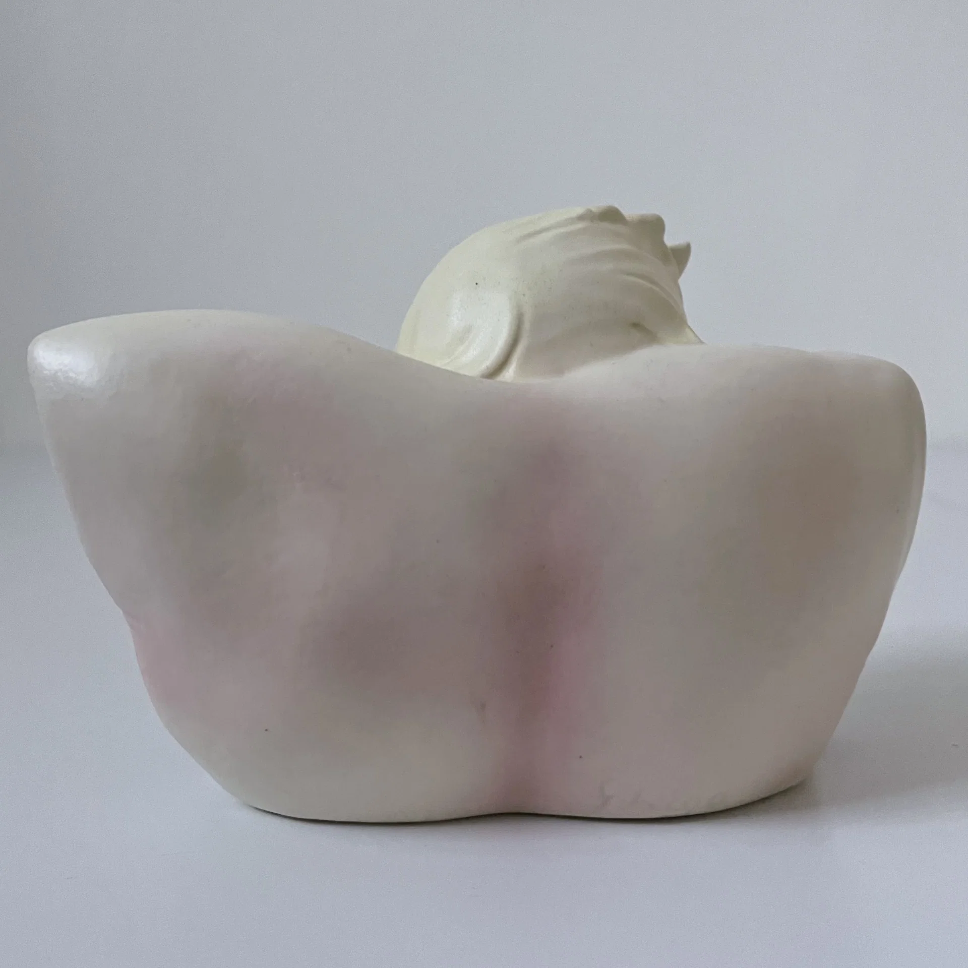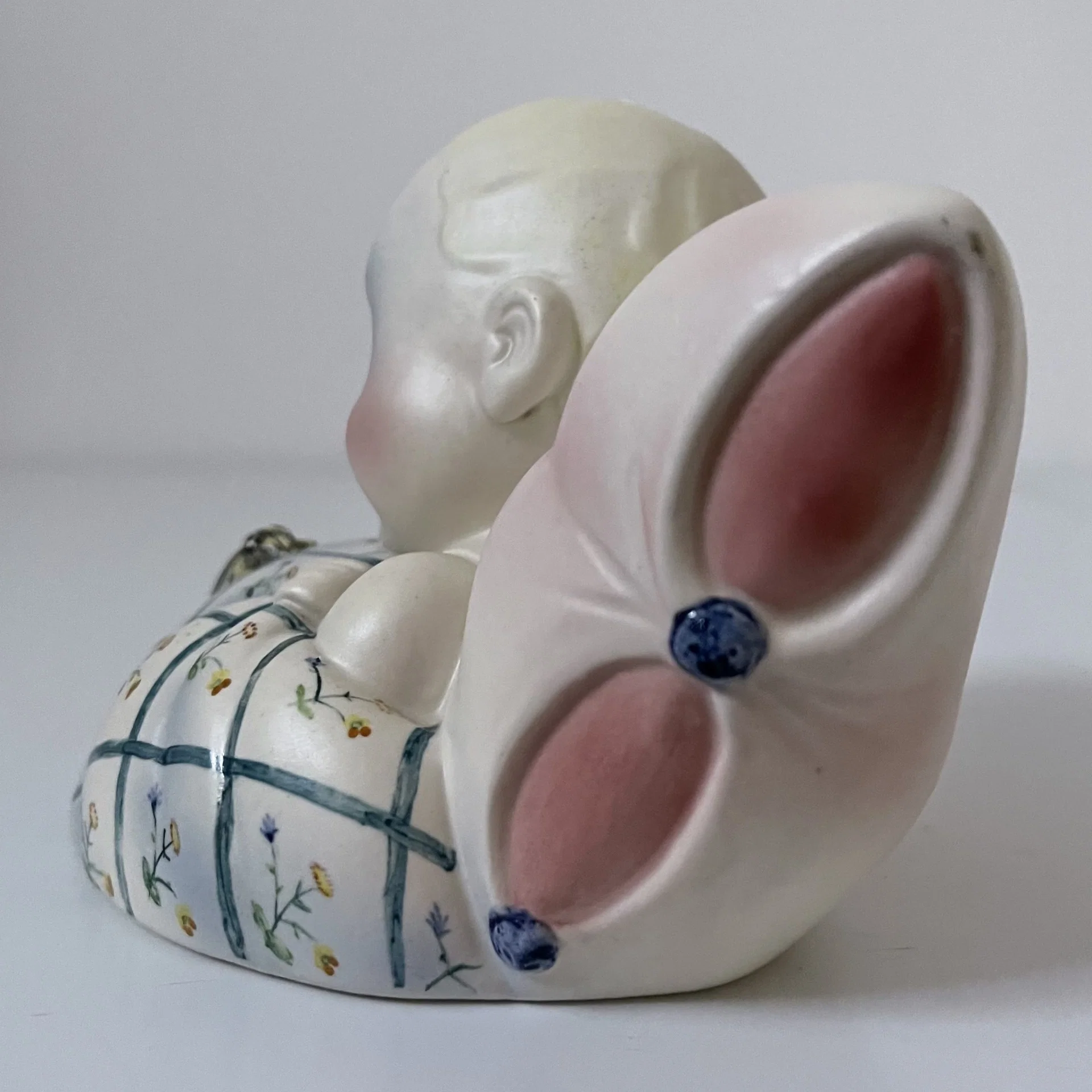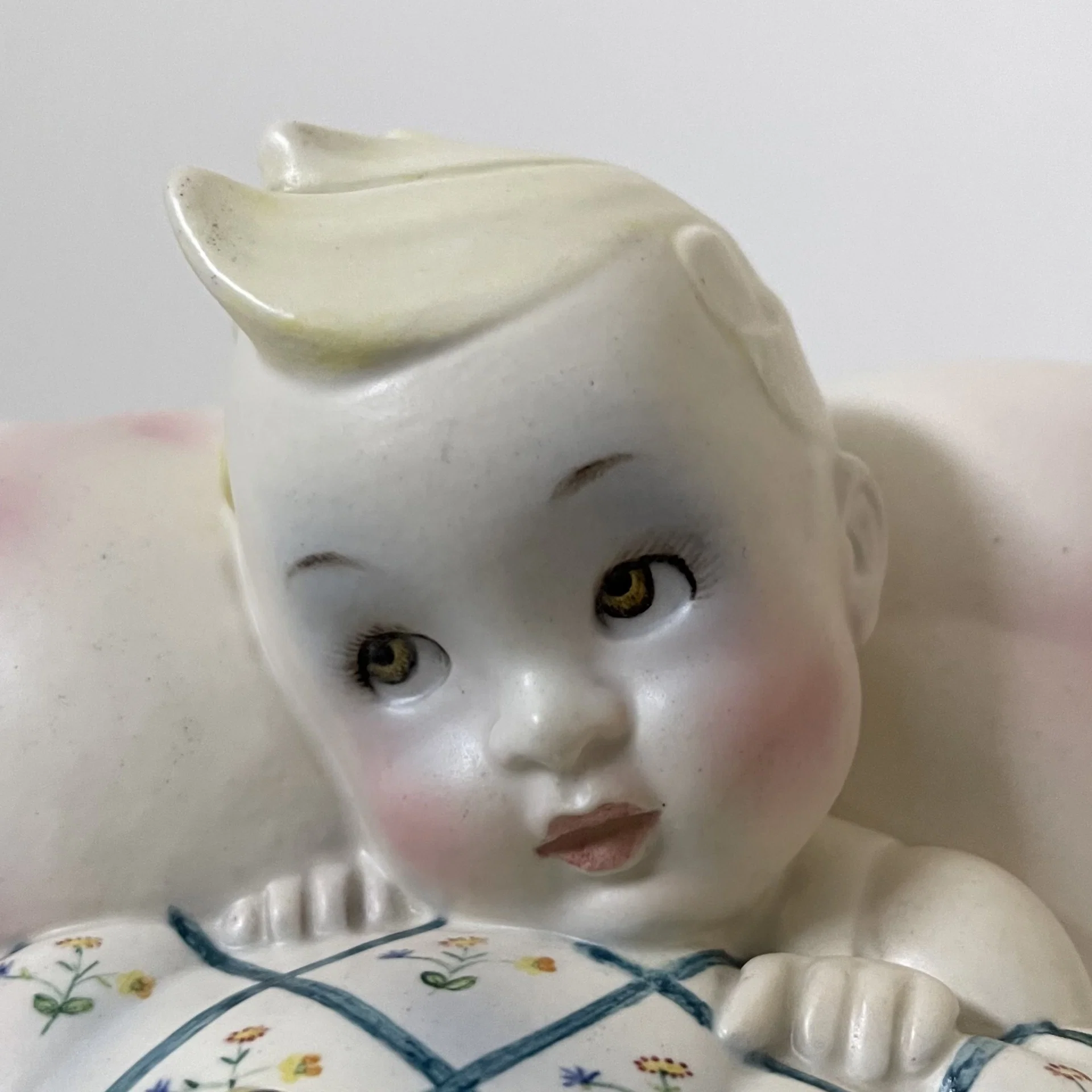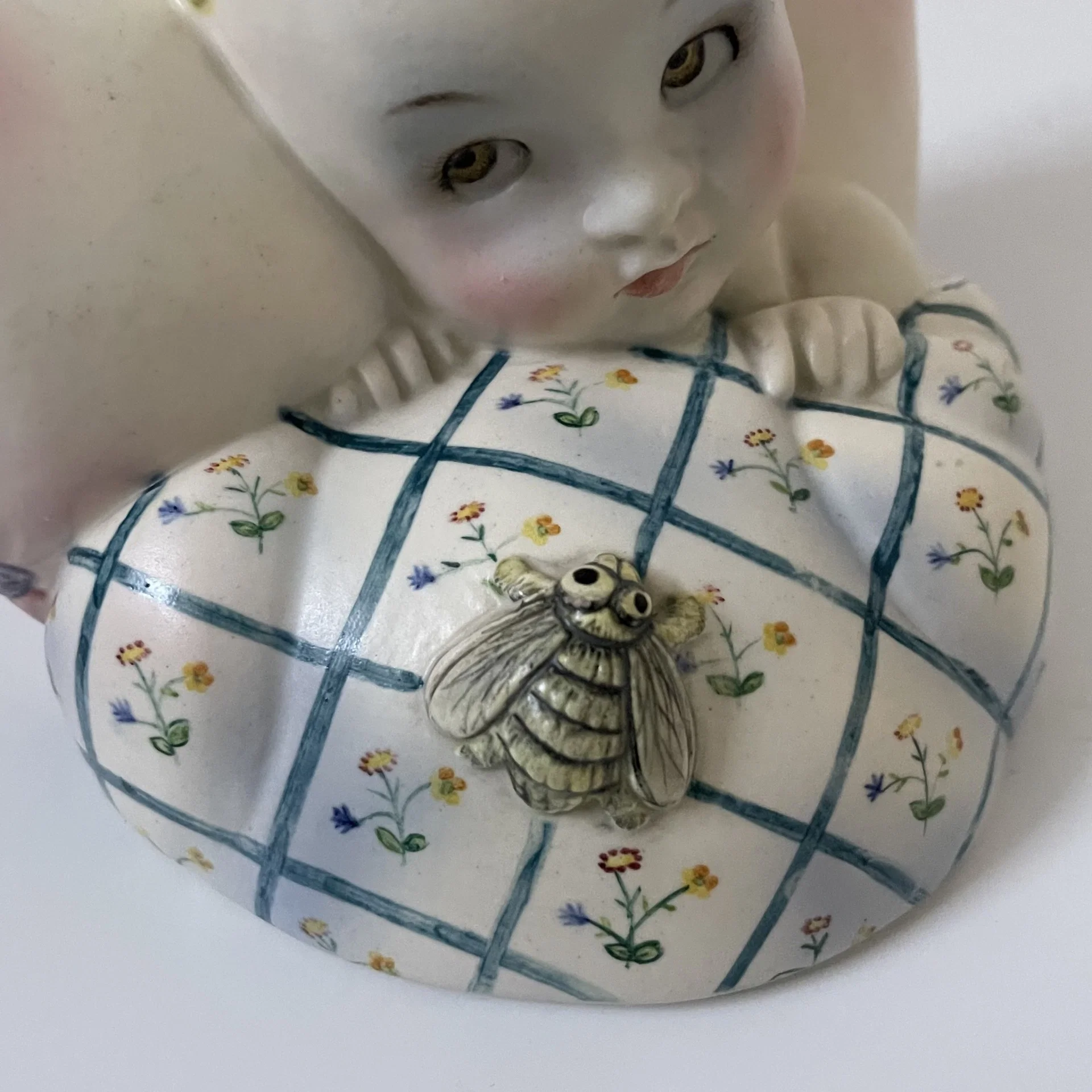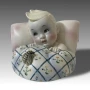 Piccola scultura raffigurante un bambino con la testa appoggiata su un cuscino e con un ape sopra le coperte, manifattura Lenci, Torino.