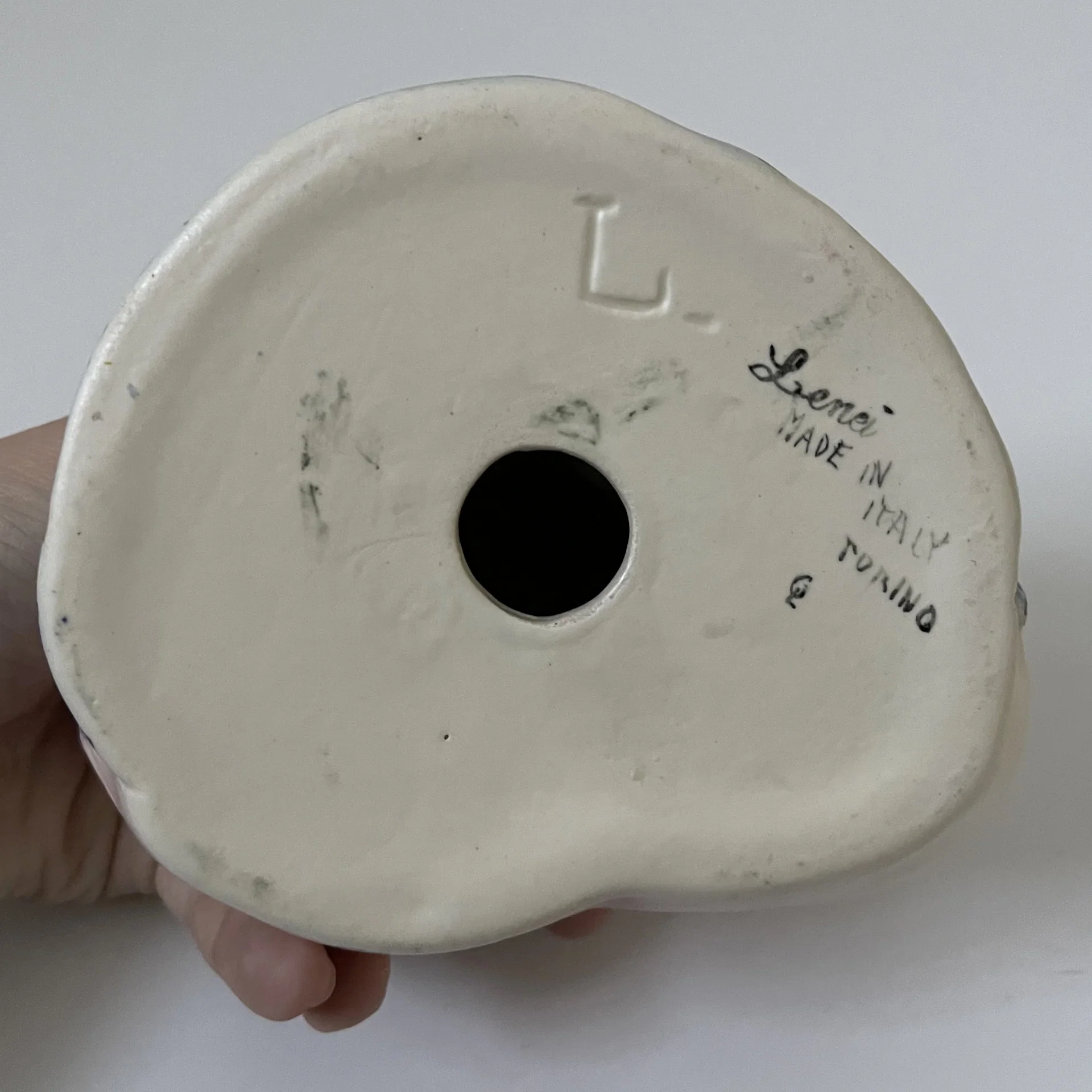 L’opera riporta sotto la base il marchio della manifattura dipinto a mano ed un monogramma incusso.