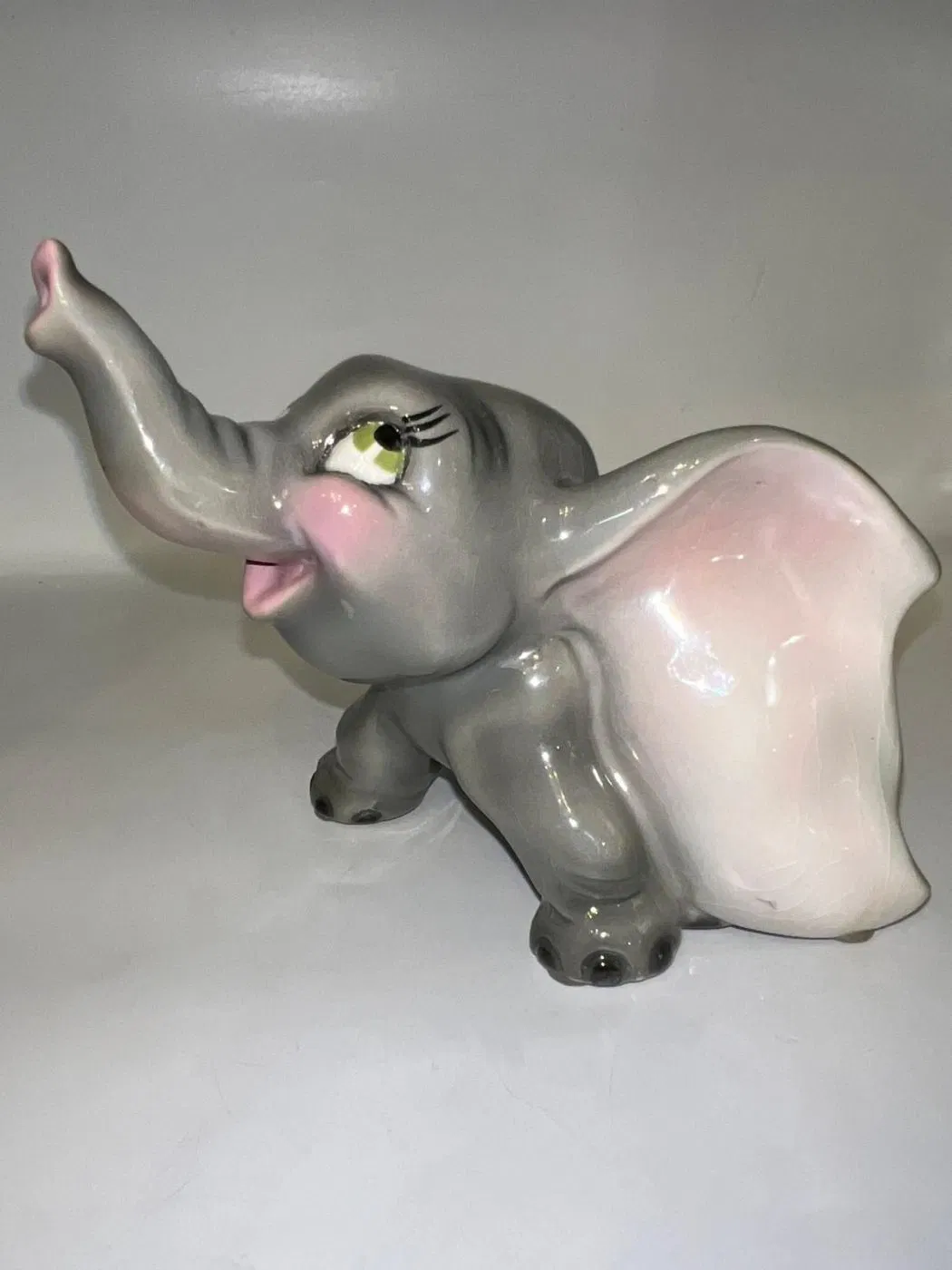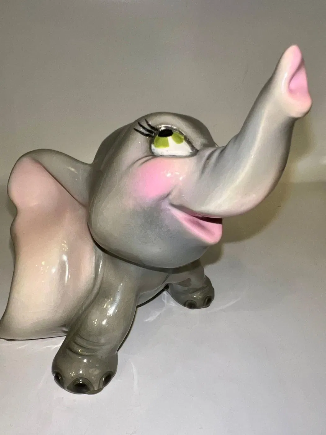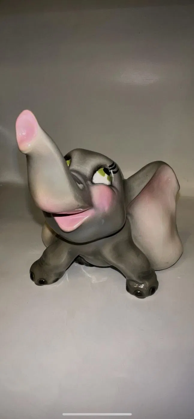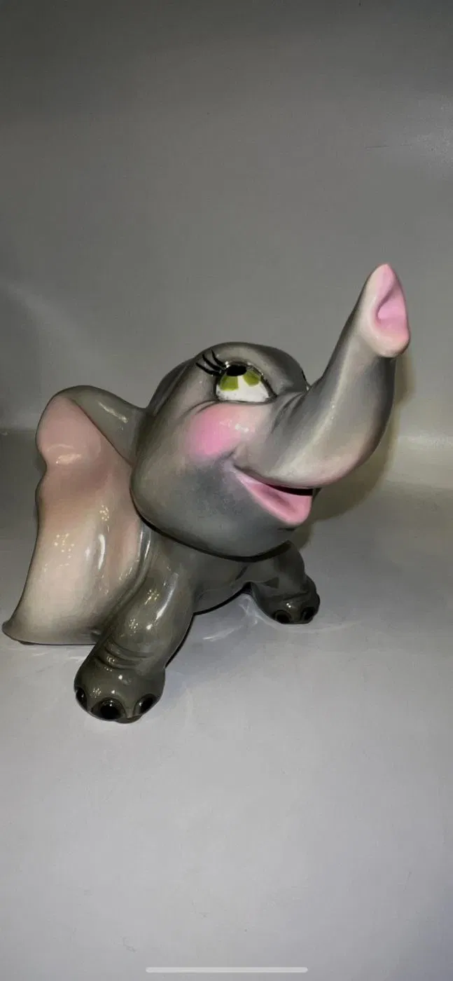 Gli occhi espressivi e curati nei minimi dettagli rendono Dumbo vivo, quasi pronto a spiccare il volo con la sua proboscide alzata, simbolo di fortuna e positività. Una ceramica che non è solo decorazione, ma emozione, perfetta per collezionisti, amanti del design vintage o per chi desidera un oggetto che racconti una storia.