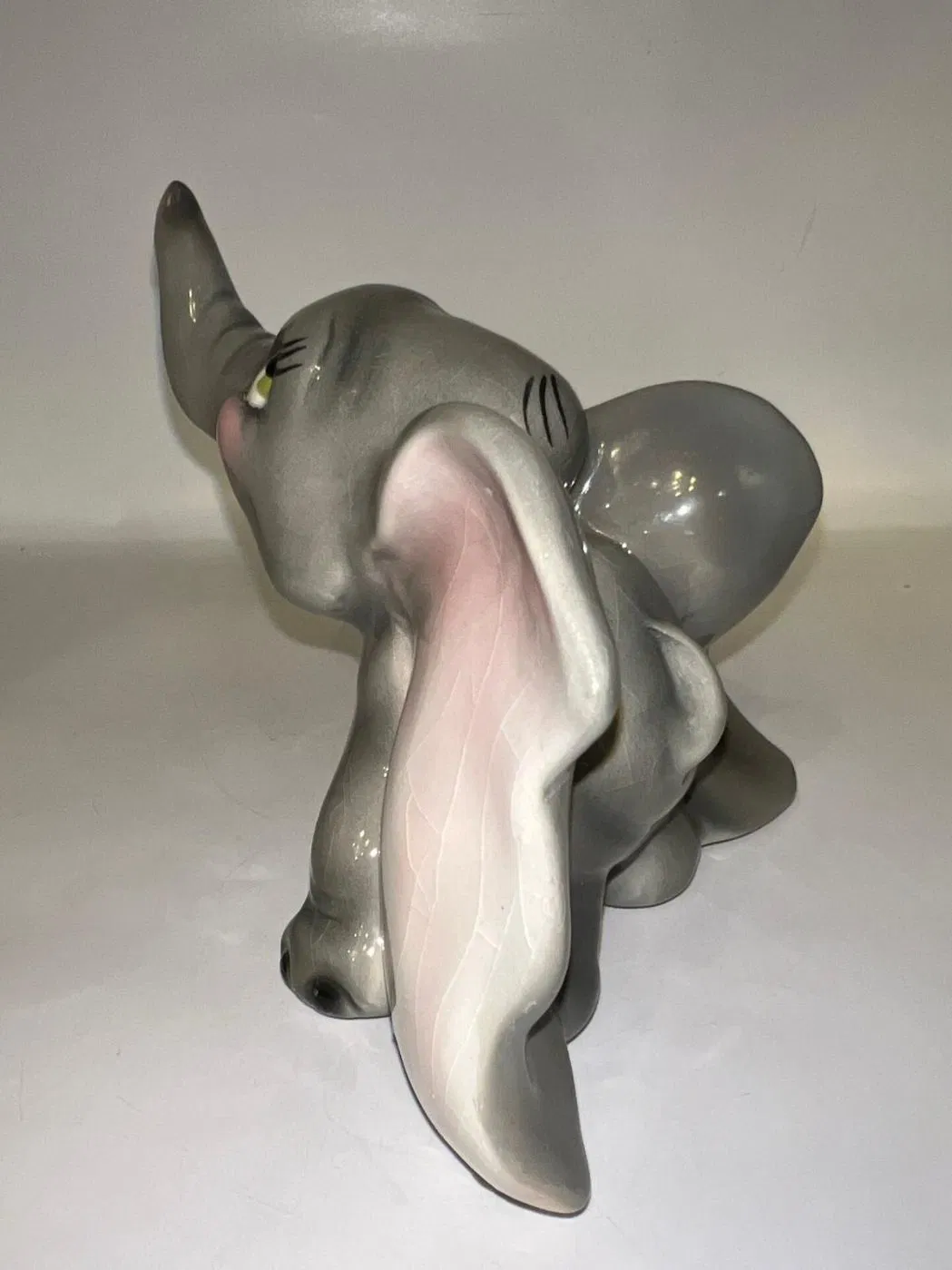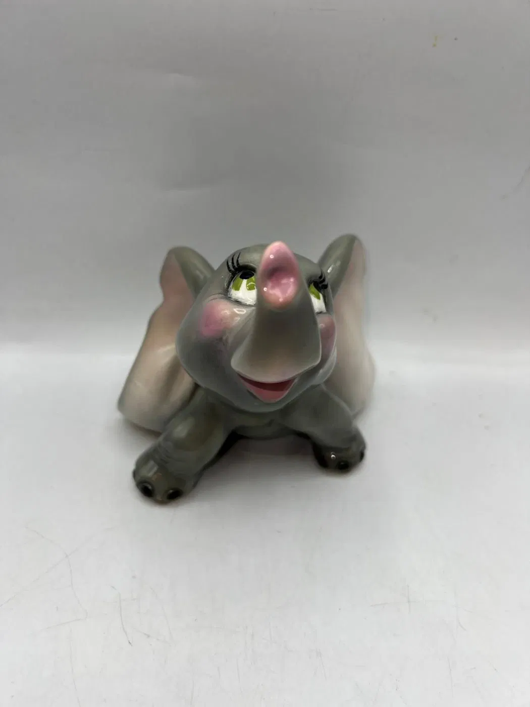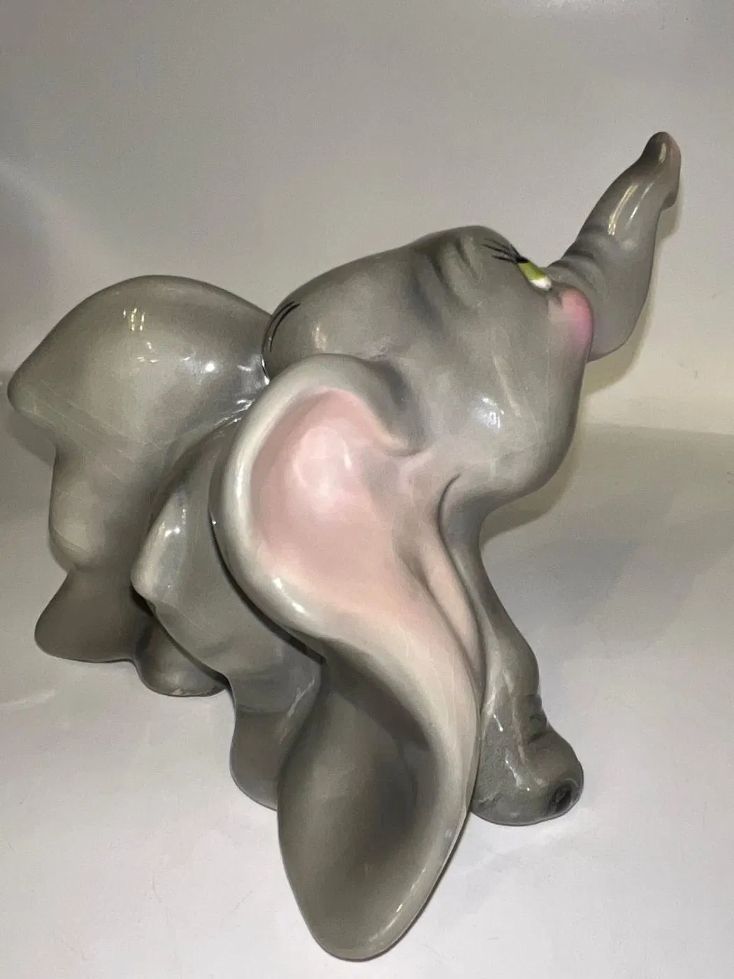 Gli occhi espressivi e curati nei minimi dettagli rendono Dumbo vivo, quasi pronto a spiccare il volo con la sua proboscide alzata, simbolo di fortuna e positività. Una ceramica che non è solo decorazione, ma emozione, perfetta per collezionisti, amanti del design vintage o per chi desidera un oggetto che racconti una storia.
